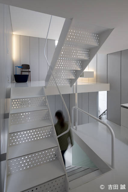 計画では、住宅の中央に縦に貫く階段を配置し、階段の踊り場を少し広くしたような南北のスキップフロアが家族をつなぎます。