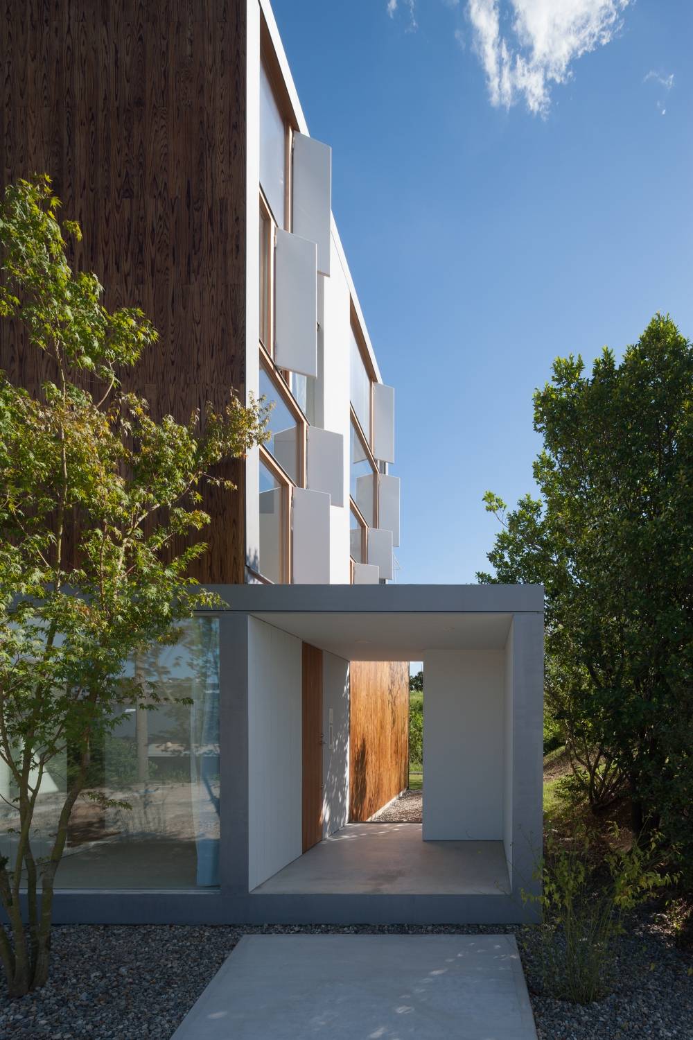 1階部分では、建物の北から、前室、リビング、ウッドデッキ、庭を抜けて棚田の法面へとまっすぐに、そして南からは、フレームのずれを通して2階のダイニングや書斎へも風景を繋げた。2階部分では、天井のフレームのずれは排熱や換気、採光のためのハイサイドライトとなる。また、シューズクロークやパントリーなどの収納やトイレを左官仕上げで作られたボックスの中に納め、フレームの間に適宜挟み込んだ。