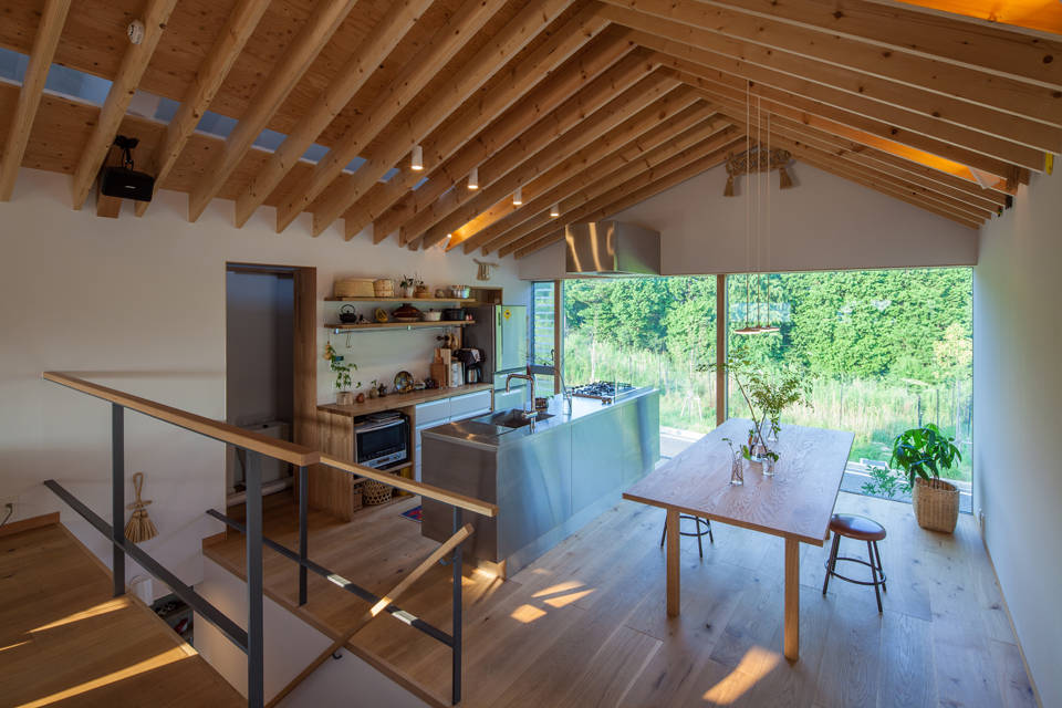 LDKには森を見渡す大きな窓があります。新緑や紅葉、冬の景色など室内に居ながら季節を楽しむため、シンプルな形でボリュームのあるLDKとしました。