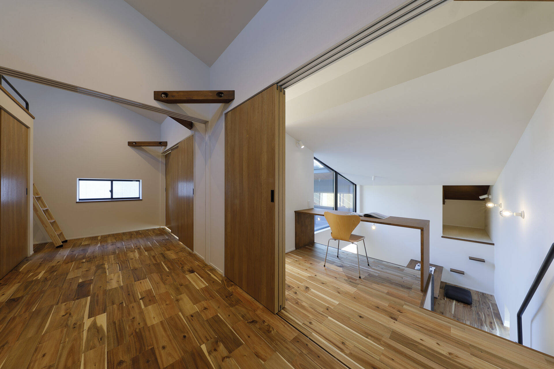 郊外の住宅地の一画にあり、隣地との関係を踏まえて、ブライバシーの高いテラス空間を中心とした、スキップ空間のある住まいの計画です。1階はLDKと寝室、2階は子供部屋の構成となっており、将来は、1階部分のみで生活が完結できる仕様としました。タタミゾーンとホビーゾーンがスキップ空間にて構成されており、リビング、ダイニングキッチンや子供部屋が、ゆるやかに繋がった一体空間になっています。