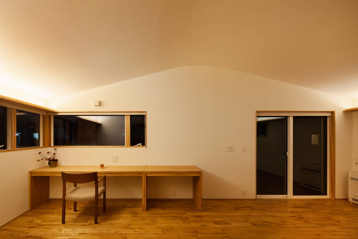 ご両親から引き継いだ庭(樹齢60年以上の梅等)と中庭デッキを地域に開く。生まれ育った家で使われていた建具も利用し、暮らしも引き継ぎながら、人が気軽に集える暖かな家。