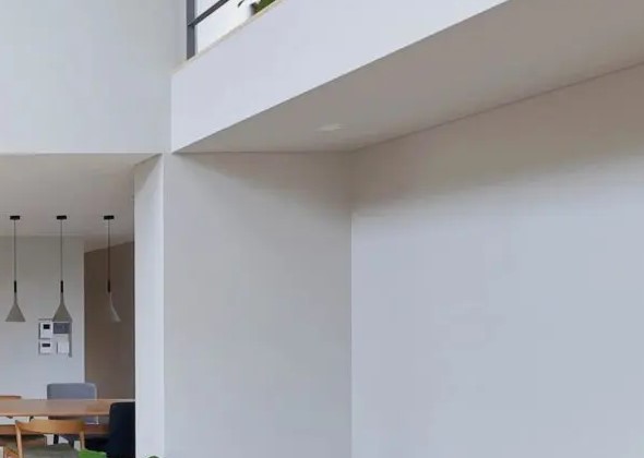 30畳という広さには、天井の高さが重要です。天井が低いと広い空間でも圧迫感を感じてしまうため、LDKの奥に吹き抜け空間を設けました。これにより、室内を奥に進むにつれて天井が高くなり、開放感を感じる空間が広がります。また、南側から取り入れる光によって、とても明るいリビングとなっています。