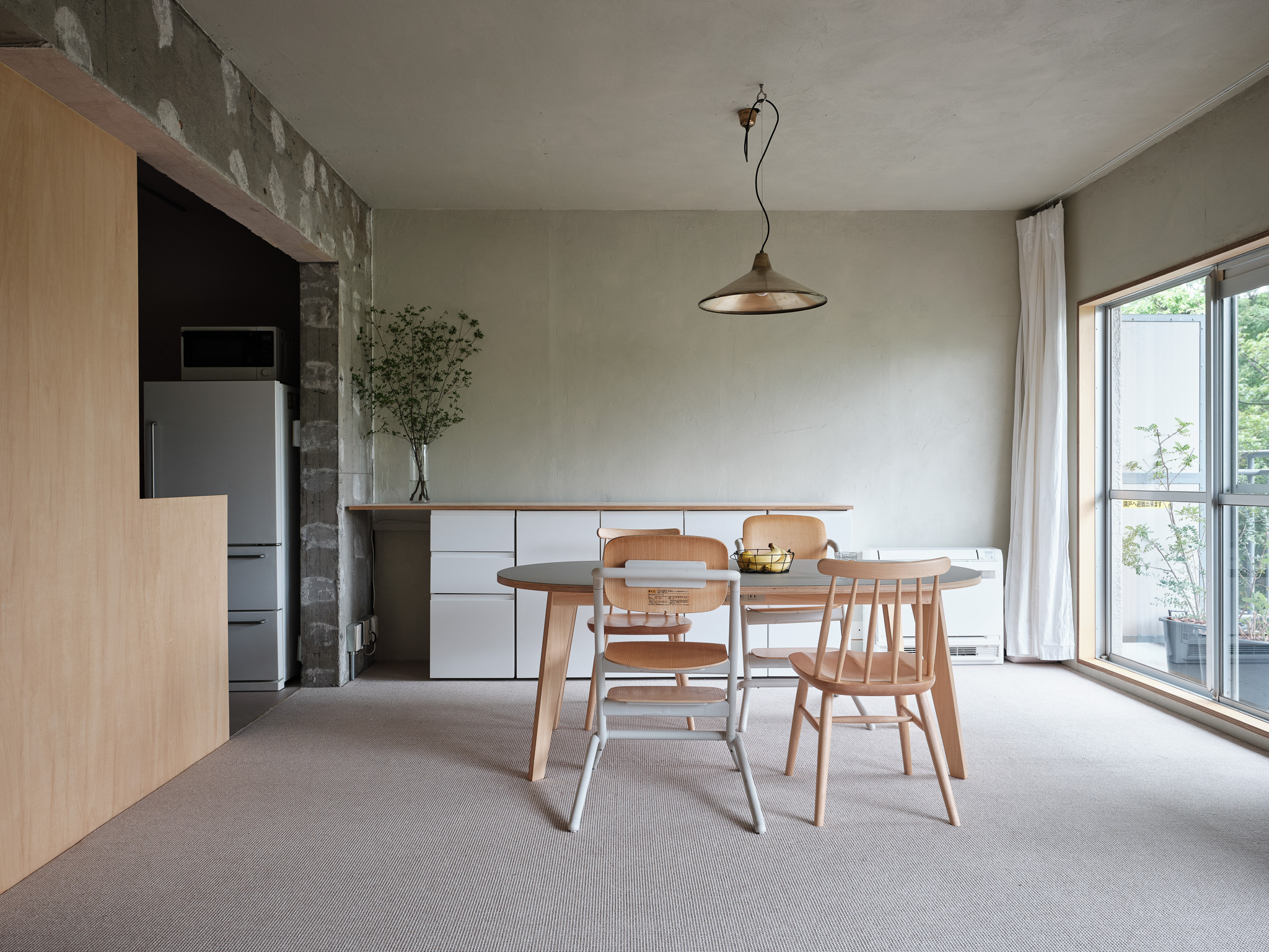 ゆるやかにつながるワンルームの空間に広がるのは、家族の暮らしに優しく寄り添う柔らかな印象のカーペット。家のどこでも気持ちよく過ごせる「床に近い暮らし」を目指しました。水回り以外のすべての床に採用したウールカーペットは、古い建物でも足元からの冷えを感じさせることがなく、下の階への音を響きにくくする効果も。北側には小上がりを設け、本来なら通行するだけの廊下も含めて多目的なスペースとして活躍します。