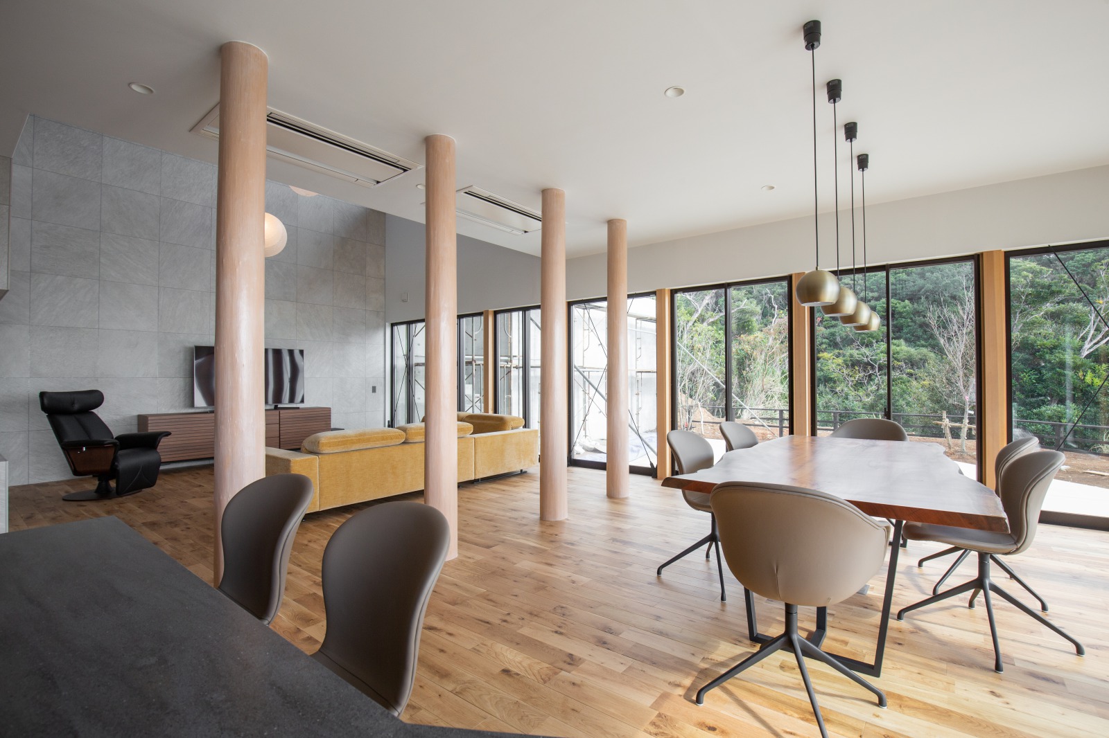 屋久島の自然との調和を大切にしたLDKでは、地元屋久島の杉をふんだんに使用し、洋風のデザインをベースにしながらも、和の要素や屋久島の自然の雰囲気を散りばめ、心地の良いバランスを追求ました。