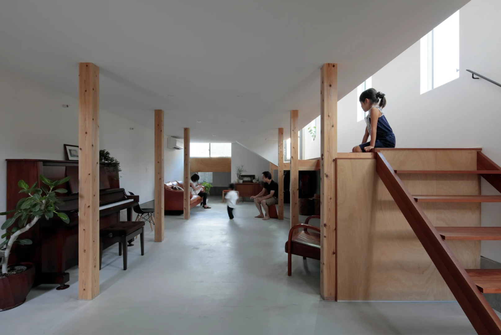 両隣が2メートルの塀で囲まれた敷地のため、1階は光を取り込めず暗いことから、1階をすべて土間にしました。小さなお子様がいるご家庭なので、今はピアノを弾いたり、元気に走り回り自由に使えるスペースになっています。