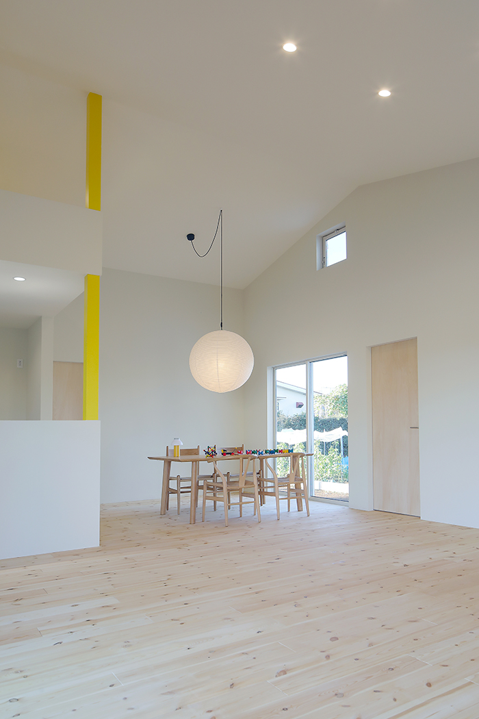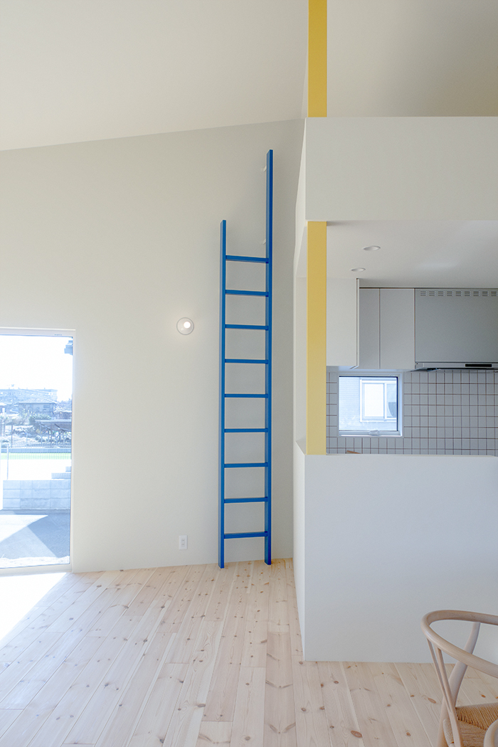 青の梯子や黄色の柱など、家の中に遊び心をプラス。そうすることでインテリアのヒントを与える役割も。床材には無垢材を使用し、木の温もりを感じながら、年月を重ねることで味わい深くなっていくその風合いを楽しめます。