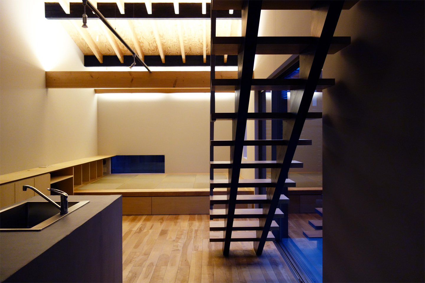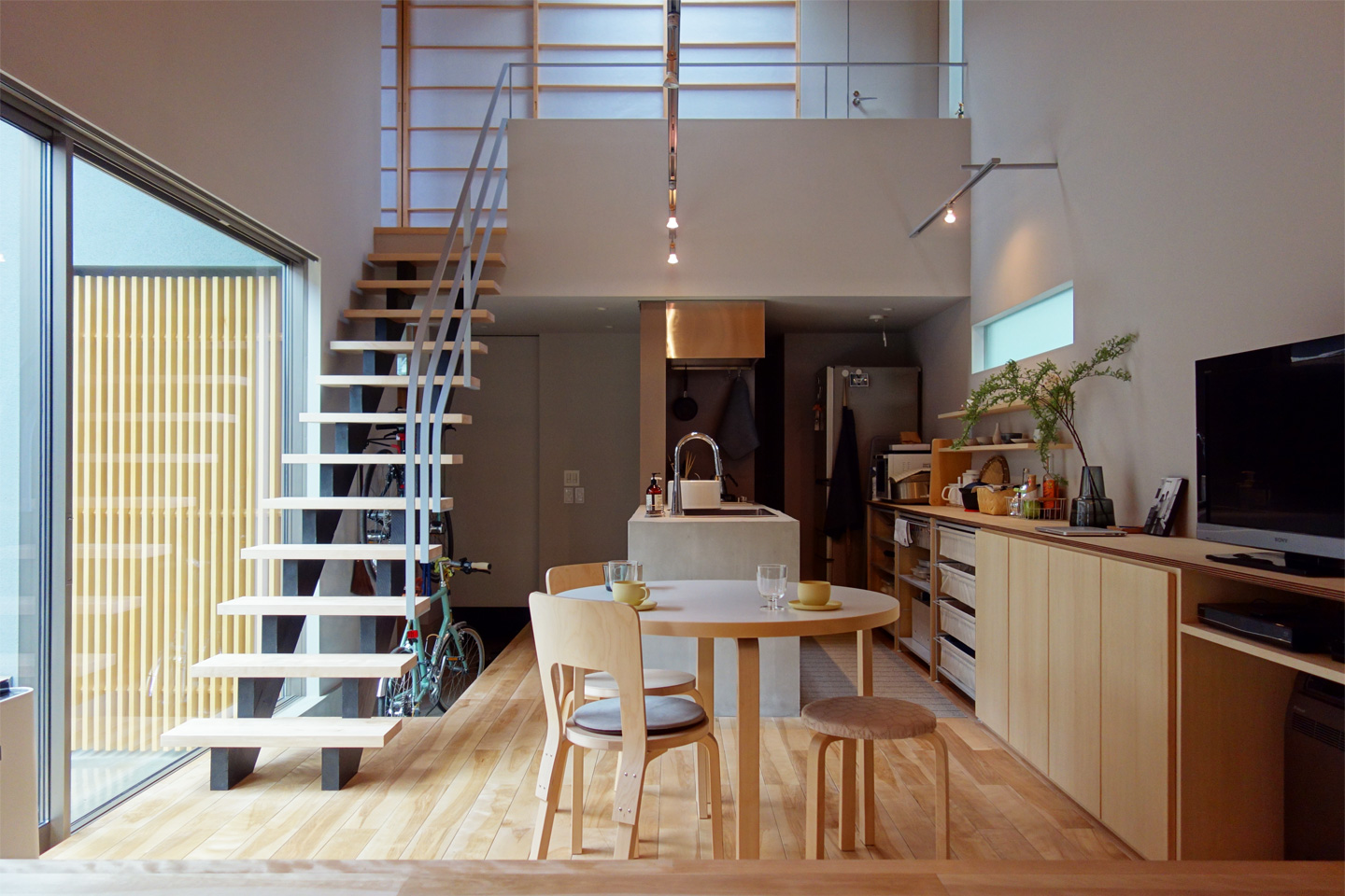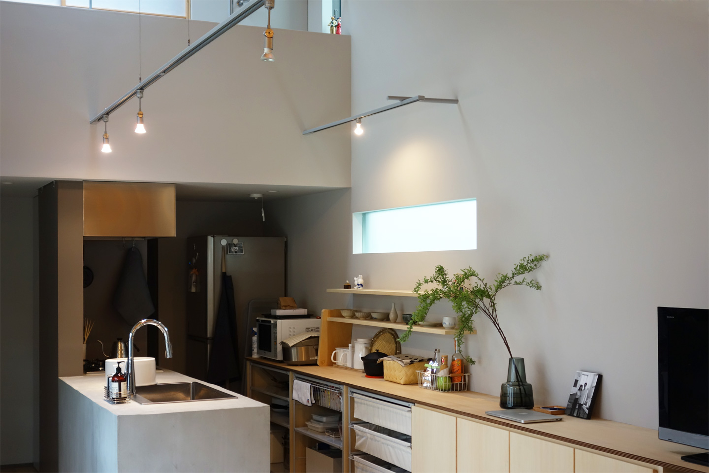 LDKの空間では木など自然素材を多用しています。木の軽やかさと温かみでキッチンを包み込むことで、コンクリートの無機質な質感との対比が生まれ、キッチンの重厚感が際立ちます。空間の「要」としての存在感を放ち、家族の拠り所となっています。