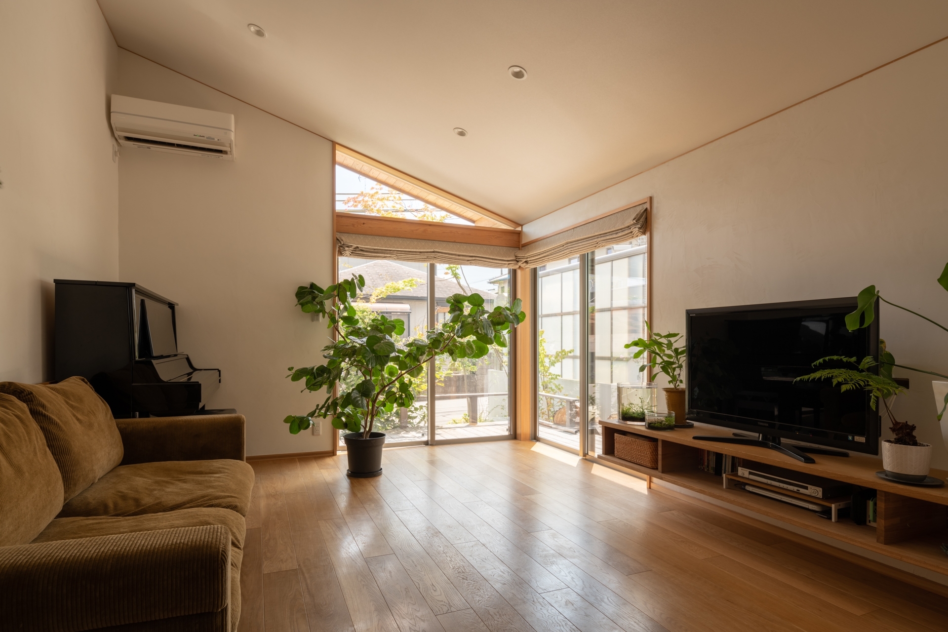 住まい手が造園家と数寄屋大工であるこの住宅は、庭と生活空間が近くに感じられることを考えて計画。内部からも美しい庭が見えるよう大きな開口部を配置。外からの目線を遮りつつも自然と調和した空間をつくりだしています。また、緩やかな階段で2階がアクセスしやすい場所となるように、階高を通常より抑えて設定。そのため、ダイニングは天井高2.1mと通常よりは低めの落ち着いた篭もりスペースに。対してリビングは最高3.3mの勾配天井とし、LDK全体で天井に動きをもたせ、変化のある空間としました。リビングに面した東側の上部三角形の窓からは朝日が差し込み、日々の生活の中で庭の美しさと共に心地よい光を感じることができます。