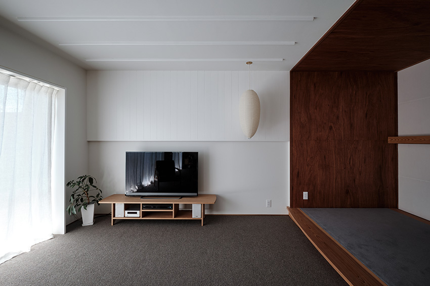 LDKからつながる子どもたちの居場所には、多少の小上がりを設けることで、空間としては一体感を持たせつつも、心理的な境界が生まれる設計に。これにより、プライベートな空間を確保しながらも、家族の気配を感じられる空間となっています。手前のスペースは自由に使える場所として、家族それぞれが思い思いの楽しみ方を見つけています。