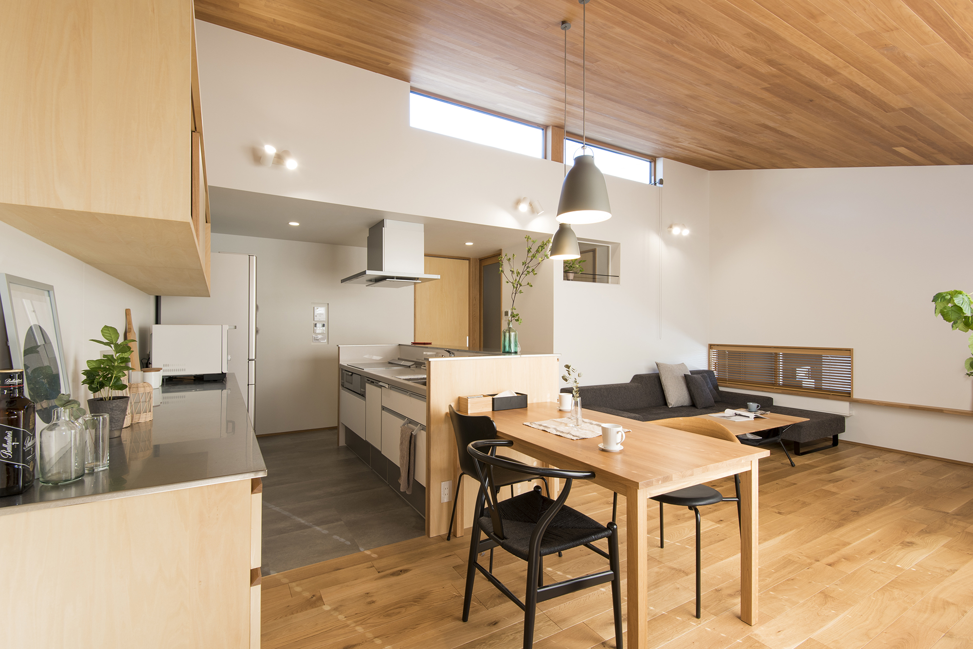 屋根成りの勾配天井を取り入れた室内は、開放感を感じさせながらも落ち着いた雰囲気が漂い、居心地の良い空間が広がります。LDKの南側には、プライベートな中庭が広がり、そこから差し込む自然光が室内を温かくし、そして潤いを与えてくれます。中庭を眺めながら過ごせるこの空間は、日々の生活に心地よい安らぎをもたらします。