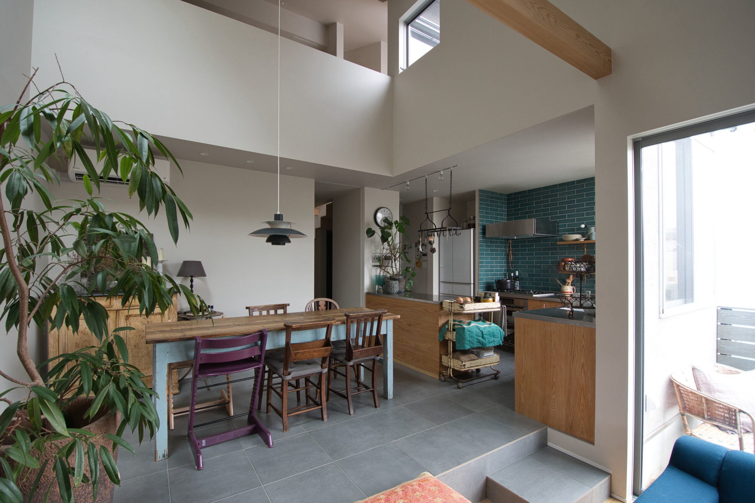 セメント調タイルをキッチンダイニングスペースに採用しました。玄関のモルタルから続くように、このカラーを選択。柔らかな印象で、圧迫感を与えることなく、アンティークやヴィンテージのインテリアも映える空間になりました。