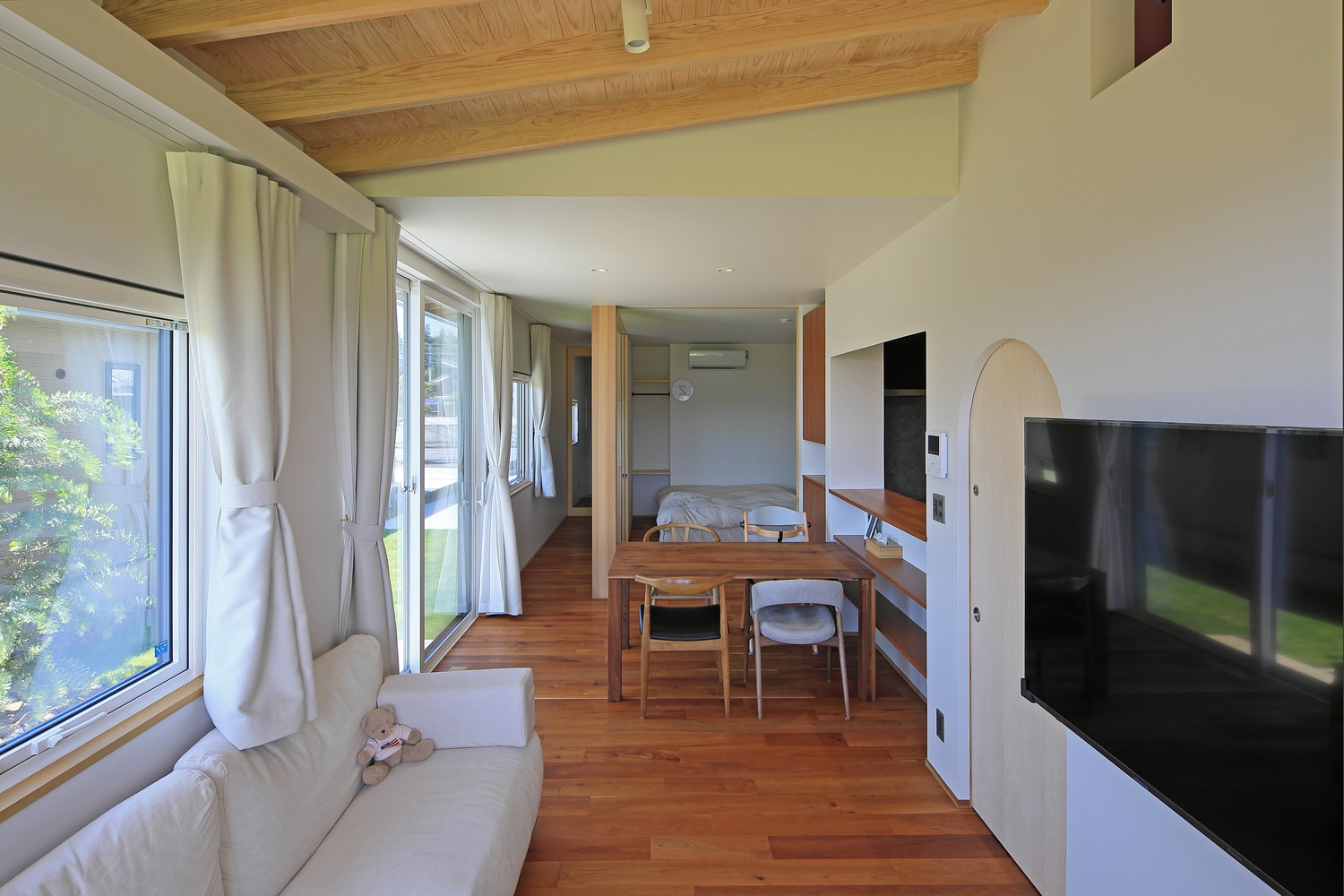 リビングには、周囲に広がる開放的な田園風景を切り取る大きな窓を設置。さらに、緩やかな勾配天井が空間にゆとりと広がりをもたらします。多くの窓から差し込むやわらかな自然光が、日々の暮らしを明るく包み込み、外とのつながりも感じられる住まいに。