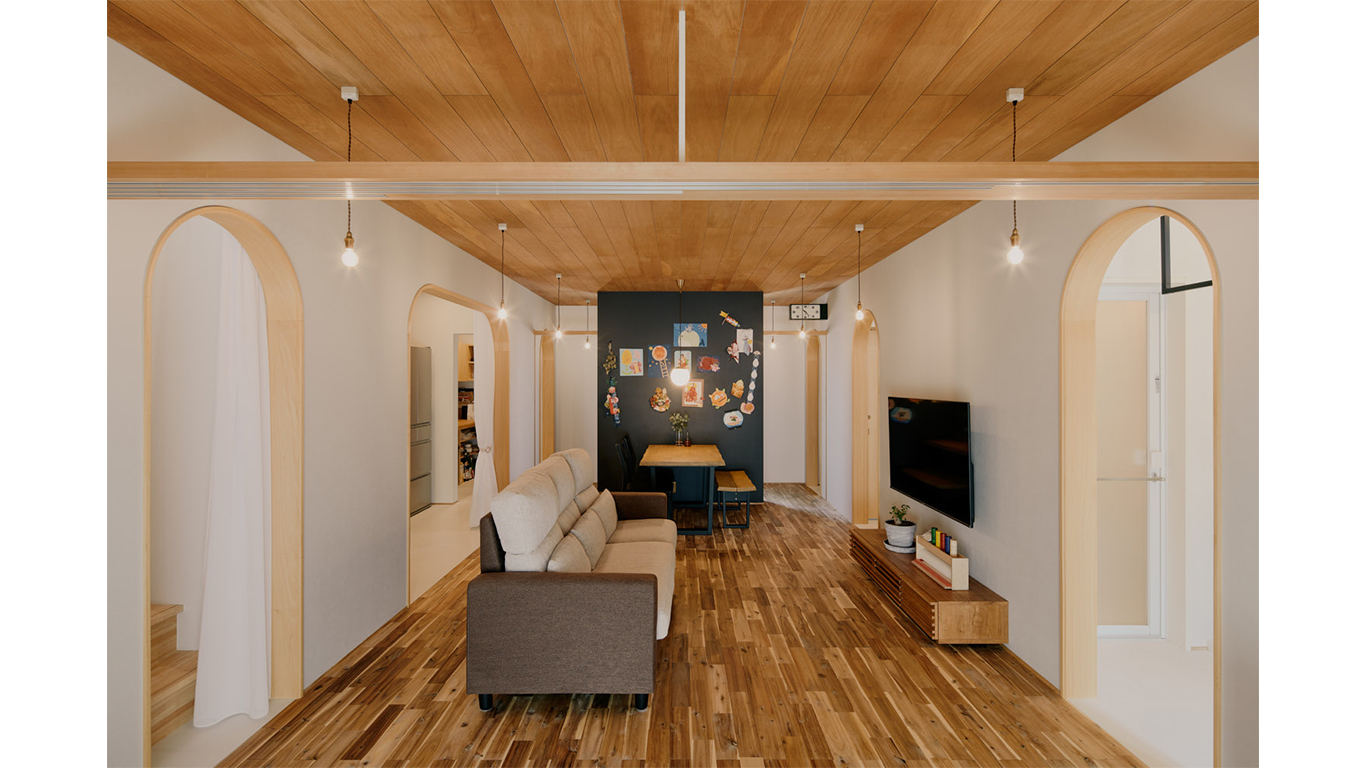 中心のリビング・ダイニングは、キッチン棟・水廻り棟、そして上階に包まれ、いわば守られるようにしてつくられた“穏やかな場所”。床や天井の目地が視線を導き、素材の切り替えやアーチの先に見える明るいトーンが、空間に奥行きと広がりをもたらす。玄関へと続く左右の小さな抜けも、空間を視覚的に開放する“余白”として機能する。靴棚は裏側から見るとリビングの象徴的な黒板となり、機能と表情を併せ持つ構成だ。そっとはりめぐらされた“さりげない”設計の妙が息づく。