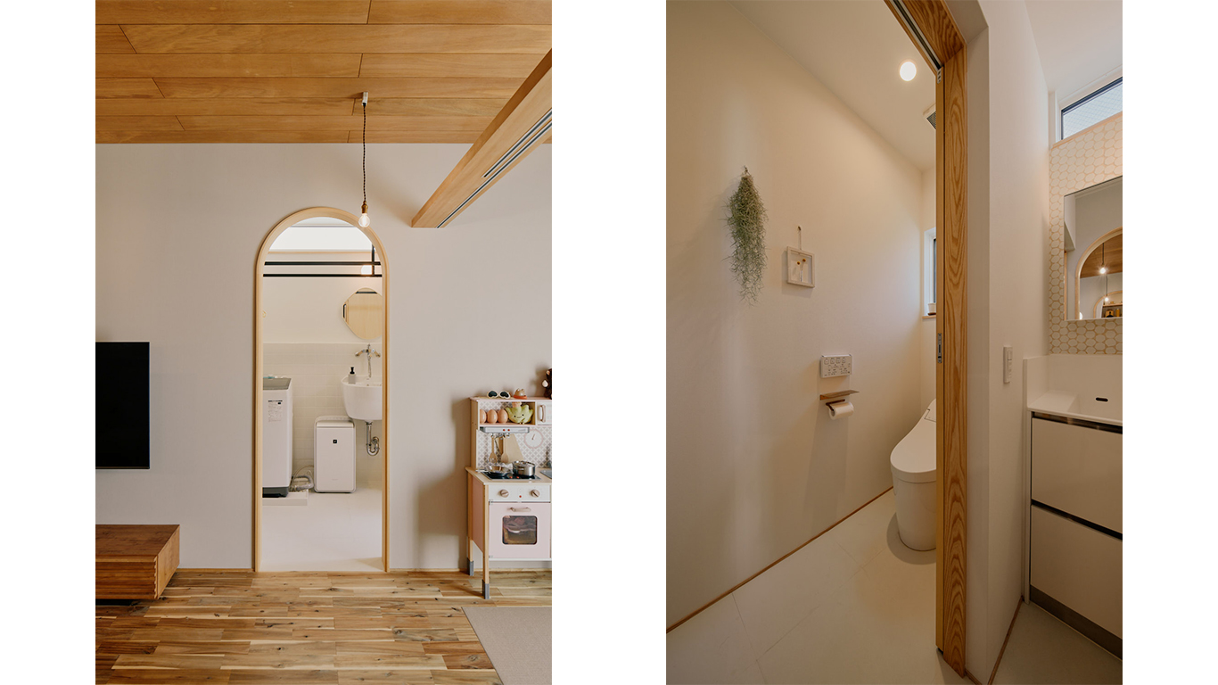 丸みを帯びた曲線は、ただの通路ではなく「くぐる」という動作によって場面が緩やかに切り替わる感覚をつくり、日々の暮らしにリズムを生み出している。