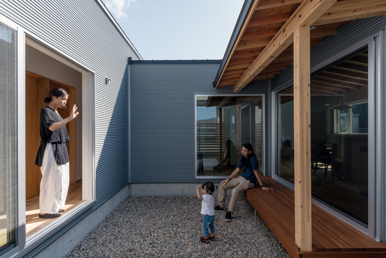 特に公園に面した西側は景観に恵まれながらも、日射や視線の問題が懸念されました。そこで、公園側にはあえて大開口を設けず、視線が抜けすぎない高さと位置に窓を設けることで、公園で遊ぶ子どもの様子をうかがいながらも、強い日差しや外からの視線をやわらげる工夫をしています。一方、キッチンから中庭に向けては大きな開口を設け、伸びやかな開放感を実現。このふたつの開口の位置をずらすことで、視線の交差を避けながら、外部環境とのつながりとプライバシーのバランスを整えました。