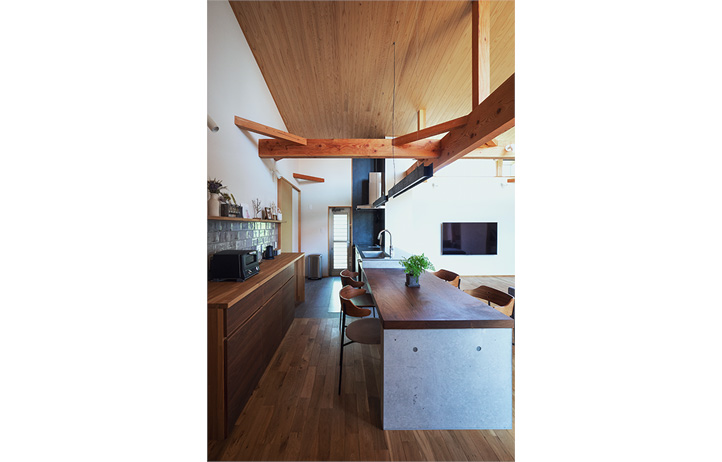 また、LDKのキッチンには、住まい手の要望に応じてコンクリートを基調としたデザインが施されています。コンクリートの脚に木をはめ込んだ造作キッチンが、木を基調にした温かなLDKの中でアクセントとなり、シンプルでありながら個性的な雰囲気を作り出しています。