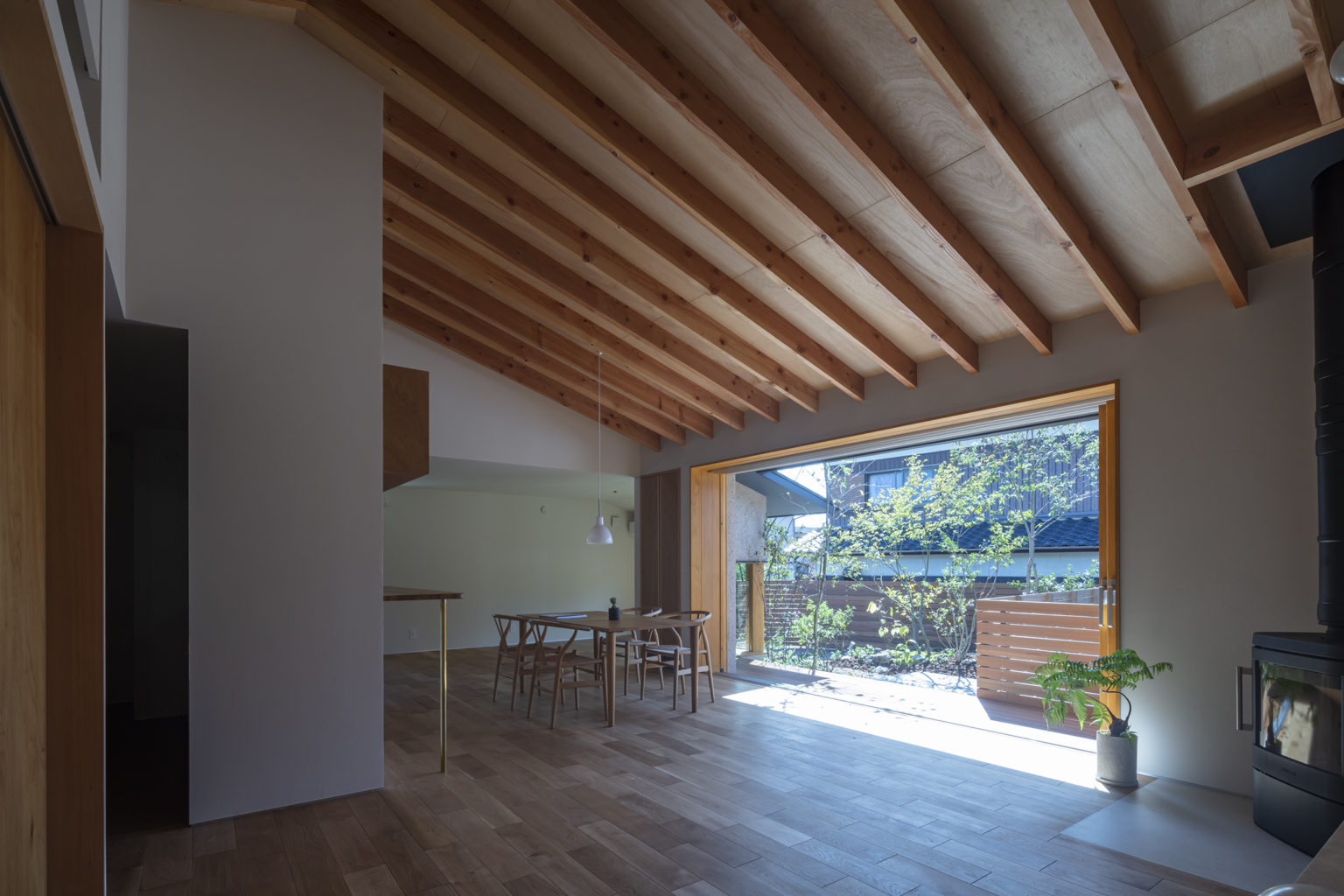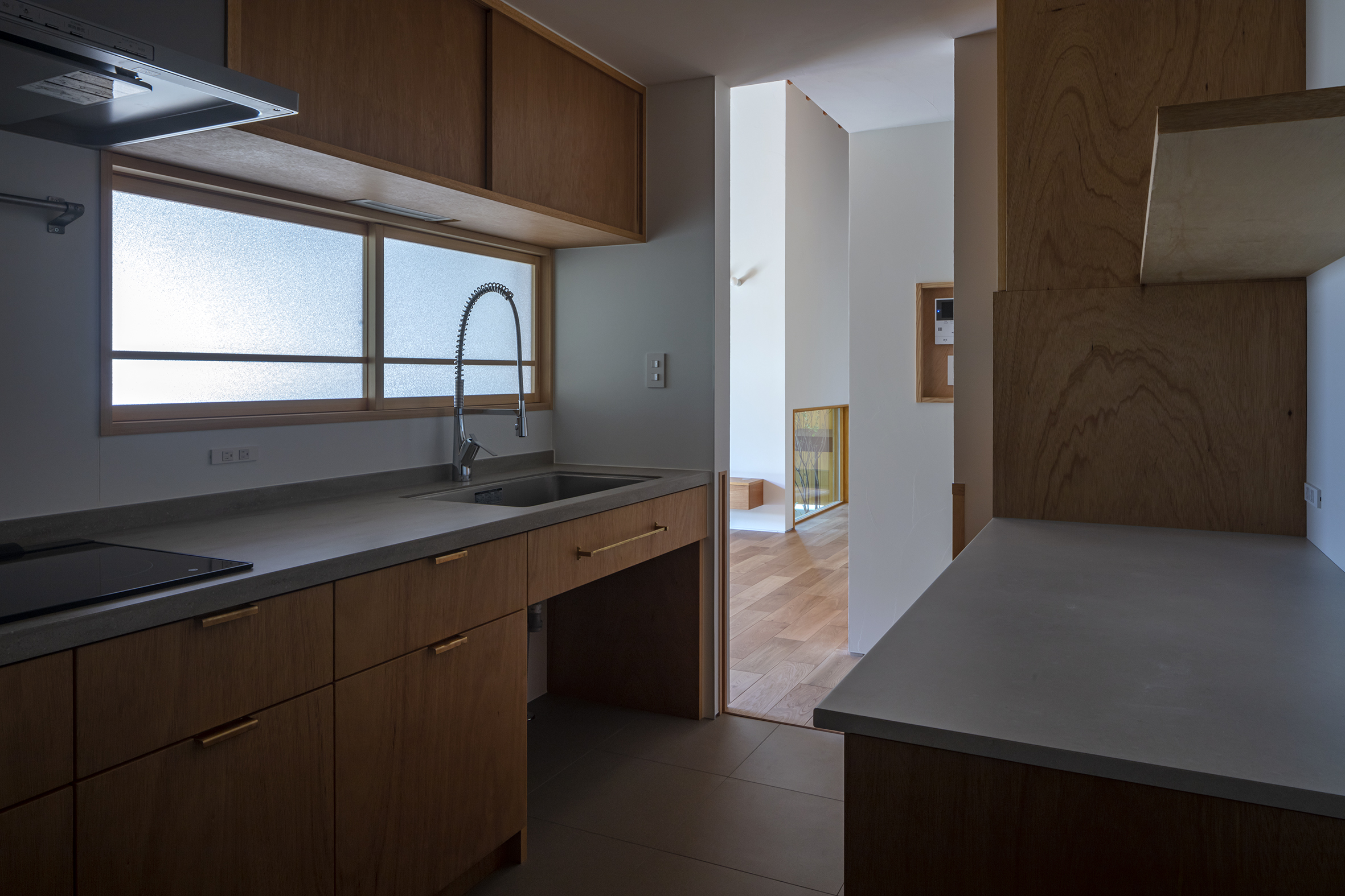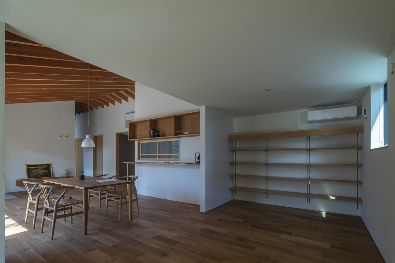 将来的に犬を迎える予定があることや、お子さんが小さいことから、キッチンの入り口は腰ほどの高さの片引き戸を設けることで、家族の安全に配慮しました。目線も抜けるので、家族の気配も感じられ、孤立しない心地よさがあります。