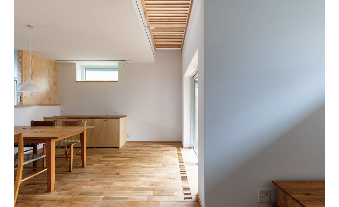 中庭に面した掃き出し窓の頭上は、ルーバー状の天井に。吹き抜けと違って2 階の生活面積が広がり、空調の冷気・暖気を上下階で循環させる役割も果たしています。このお宅ではルーバーの上を物干し場に。窓際で風通しがいいため室内干しにはぴったりです。