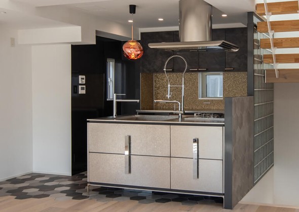 奥まったキッチン環境を活かしたことで、別世界に足を踏み入れたような楽しさを感じる、大人の遊び心が映えるキッチンとなりました。