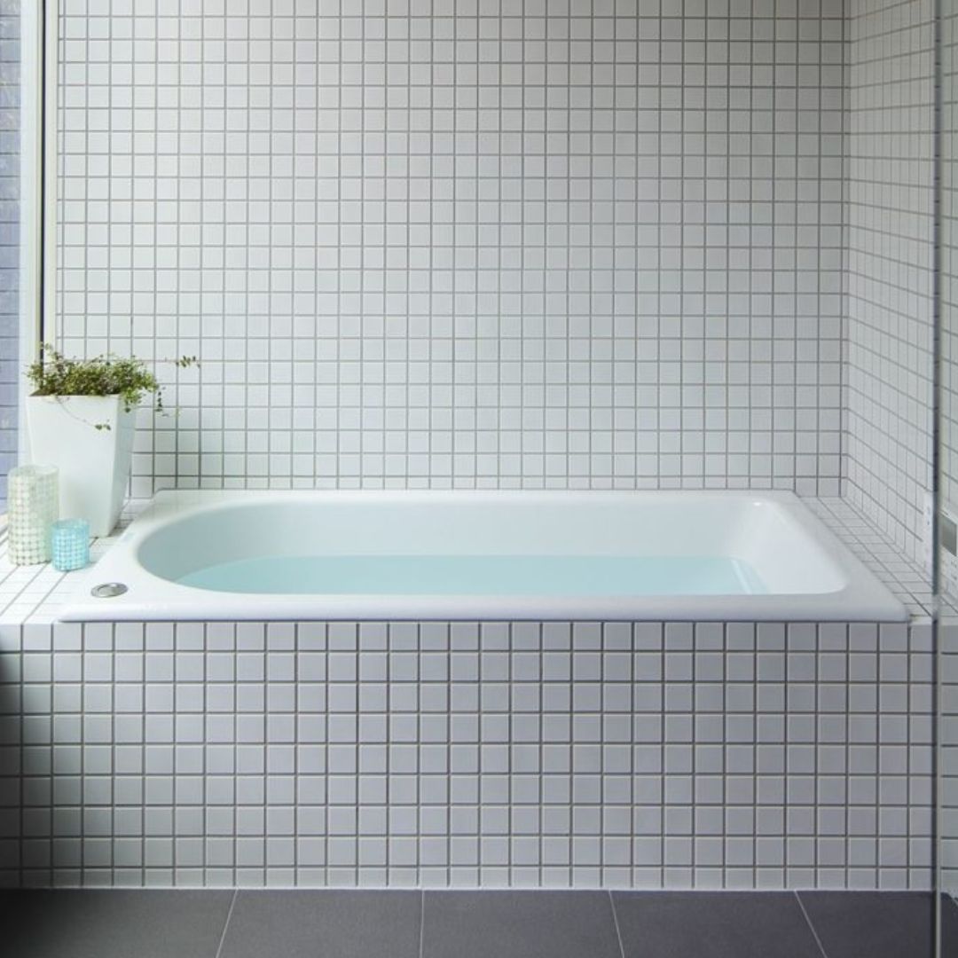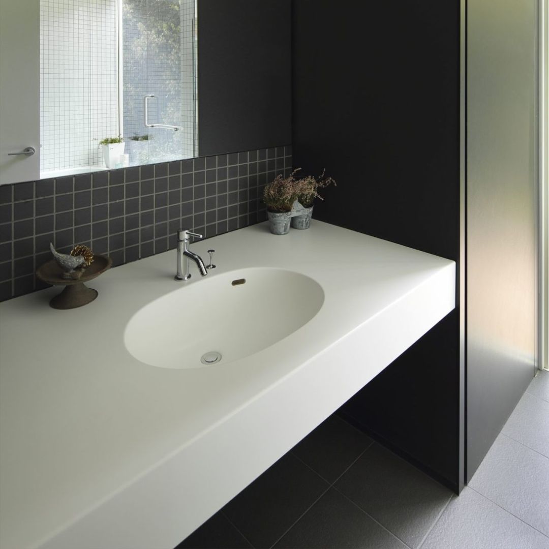 窓枠のないFIX窓が、緑を切り取ったような美しい眺めを生み出し、白いタイルの内装がその景色をいっそう引き立てます。入浴のひとときを、静かで豊かな時間へと導く空間です。洗面脱衣室はサービスヤードに面し、家事動線をコンパクトにまとめながら、採光と通風をしっかりと確保。
