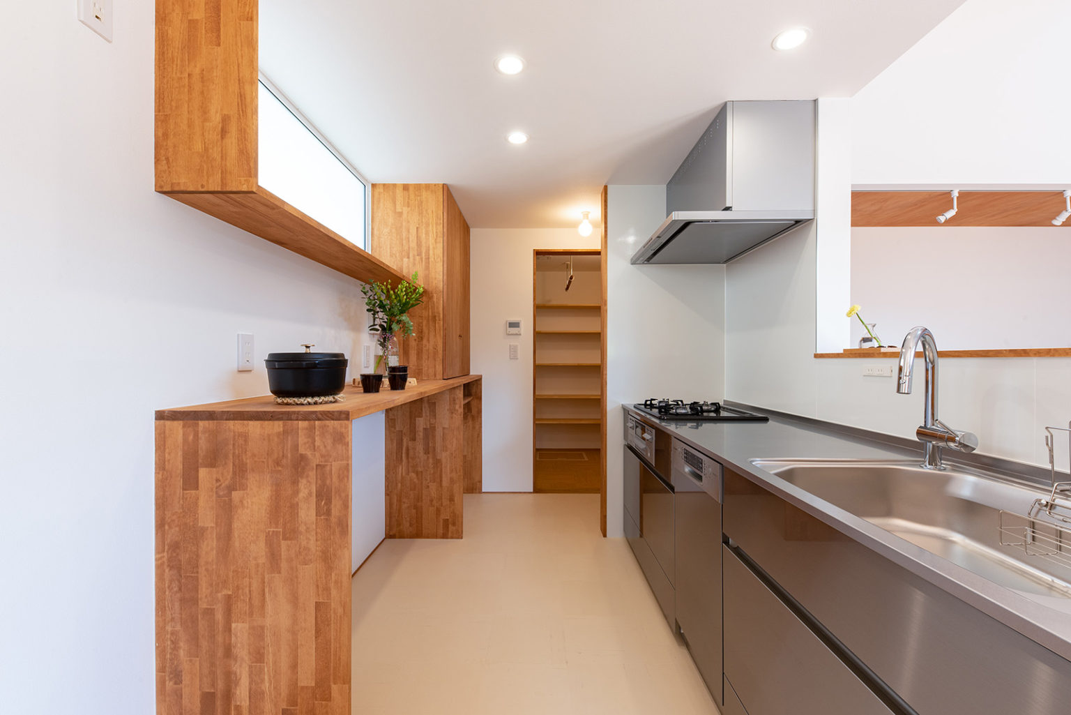 そんな悩みを抱える施主の方も多いです。そこで提案している工夫が、キッチンの天板部分(ステンレストップ)のみをオーダーメイドで購入し、下の収納部分は大工さんに造ってもらうというものです。これによりコストダウンだけでなく、サイズや高さなど、使う人の希望に沿った使い勝手の良い一点物のキッチンを創ることができます。