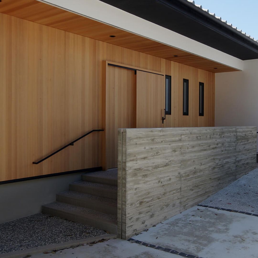 数百年の歴史をもつ寺院の境内という特別な環境に配慮し、日本瓦と漆喰で仕上げた寄棟屋根の平屋建築。周囲と調和し、控えめな佇まいを意識しました。日本瓦の屋根をあしらい、周囲の景観に溶け込むよう設計された外観は、落ち着きと品格を漂わせます。