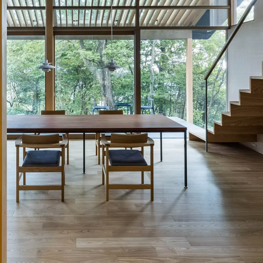 森に面したLDKは、全面ガラスの開口によって緑の風景を室内へと引き込み、まるで林の中で暮らすような感覚をもたらします。LDKの外には、勾配屋根がそのままテラスへと連なり、軒下のような半屋外空間が雨の日にも自然を身近に感じられる場となっています。キッチンの奥には作業スペースも確保され、日常の動きが自然と調和するように設計されました。
