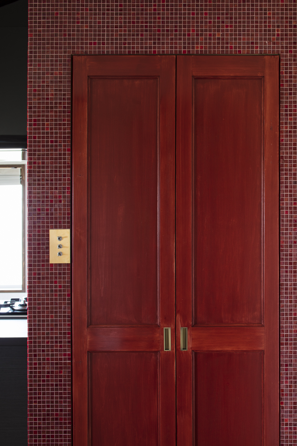 中でも印象的な赤のベネチアンガラスタイル。色選びに多くのサンプルを取り寄せ、打ち合わせを重ねて一番印象的な赤をセレクト。