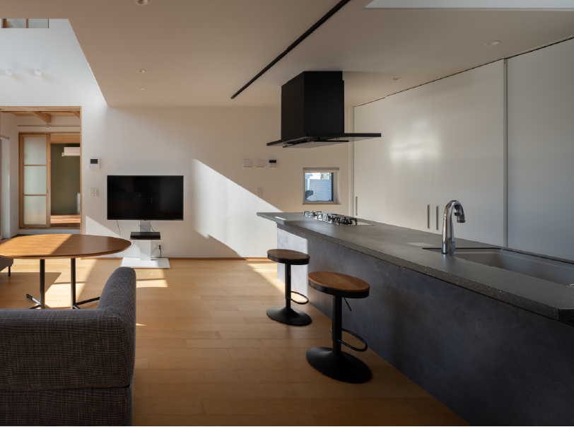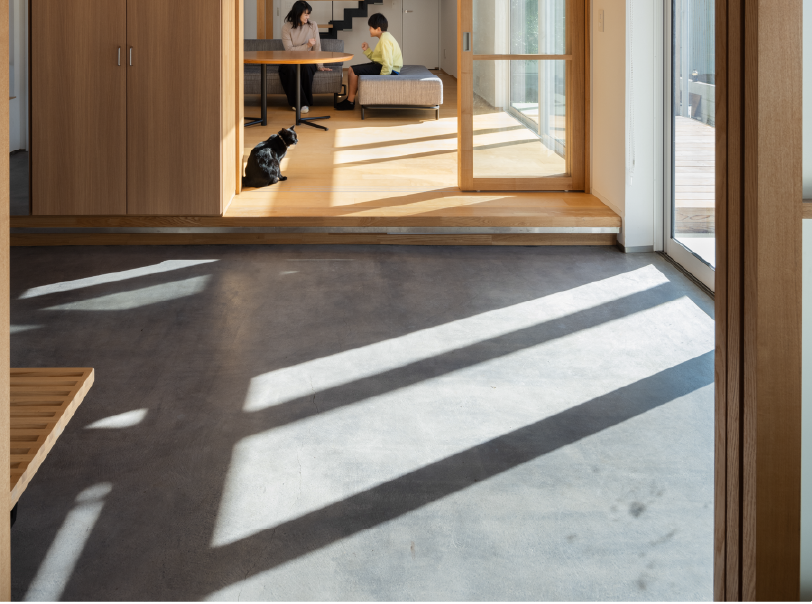 通り土間・吹き抜け・バルコニーの「3つの間」を立体的に繋いだ空間に、光と風がめぐり、家族の気配がふわりと通り抜けます。