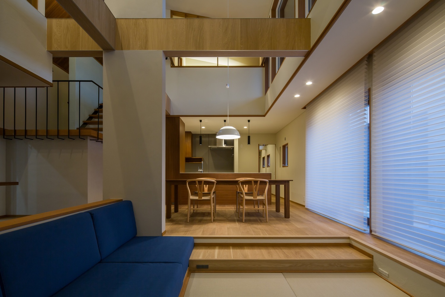 開放的なLDKの空間に変化を付けて床を下げることで安心感がありキッチンからも見渡しやすい空間になります。リビングのオーク床材に合わせた色合いで縁なし畳は北欧モダンな空間に違和感なく馴染みます。
