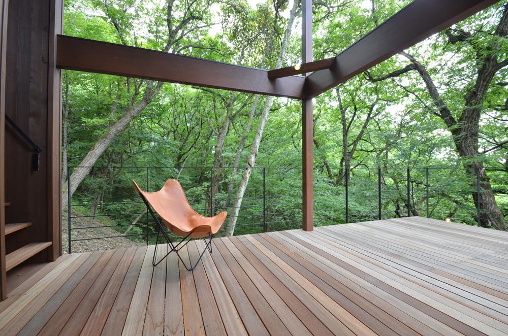 段差によって空間を緩やかに分けながらも、ひと続きの広がりを感じさせるスキップフロアの設計。床の高さを少しずつ変えることで、視線や光にリズムが生まれ、開放感と奥行きのある空間が広がります。リビングから続く半屋外のデッキでは、空と緑を眺めながら四季の移ろいを楽しむことができ、吹抜けと高低差が空間に一体感をもたらします。スキップフロアは狭小地に限らず、広い敷地で間延びしてしまう空間にも効果的です。