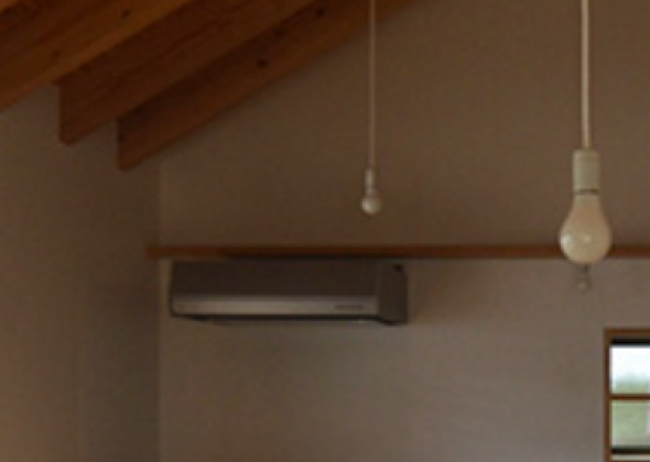 この住まいでは、空調設備は補助的なものとして考えています。エアコンはリビングなどには設置せず、2階の小屋裏に配置。屋根を支える垂木と垂木の間にある 面戸  の隙間を利用し、冷やされた空気が小屋裏から2階へ、そして階段室を通って1階へと落ちてくるように設計しています。こうした空気の道をつくるため、階段やルーバーの配置に工夫を凝らすことで、暖かい空気は上へ、冷たい空気は下へと流れる性質を利用し、家全体に空気が自然と循環します。