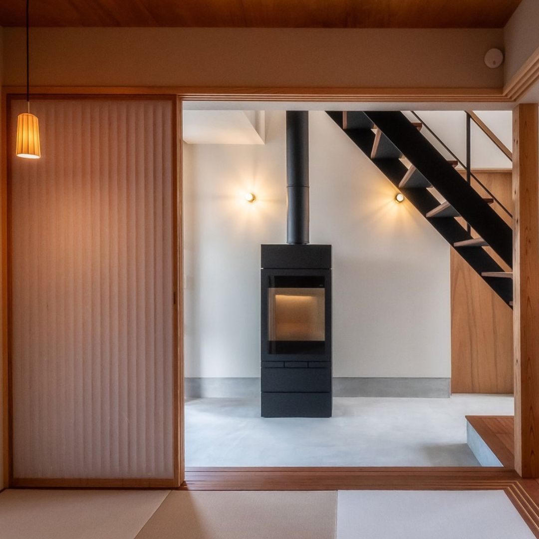 1階の土間スペースには、断熱性能の高いスキャムサームの薪ストーブを採用しました。暖房効率が高く、1階だけでなく吹き抜けを通じて2階までしっかり暖かさが行き渡ります。シャープなデザインも空間に映え、性能・デザイン性ともに優れた1台です。