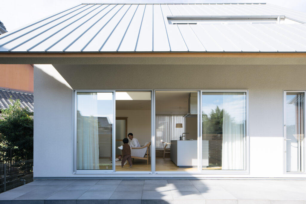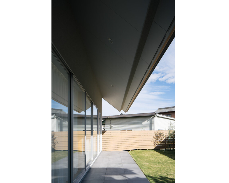 この大屋根は、空へとつながり、光や風とが一体になるような軽やかな白で仕上げられています。大きな庇は夏の日差しを遮り、冬は室内に光を取り込むため、一年を通して快適に暮らせます。