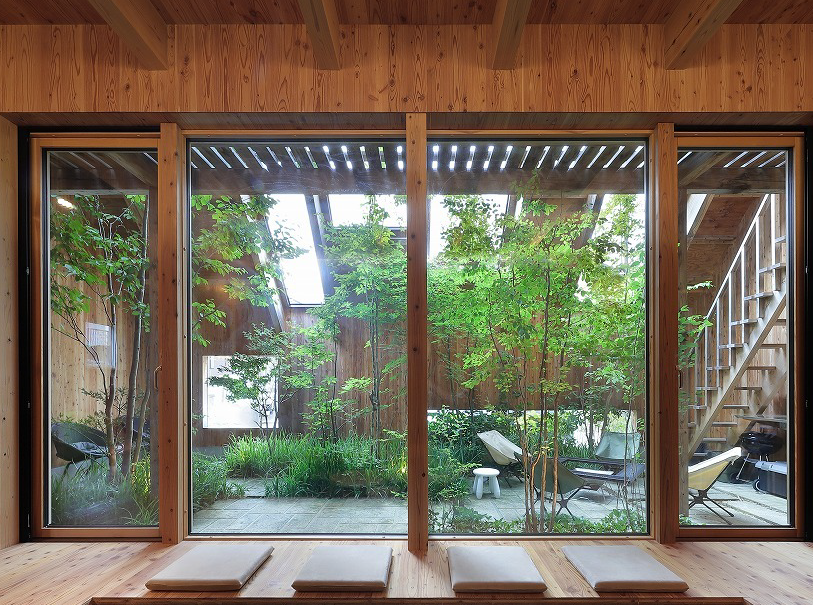 中庭には屋根がかかり、緑の間を縫って差し込む木漏れ日がやわらかい陽だまりを作り出します。