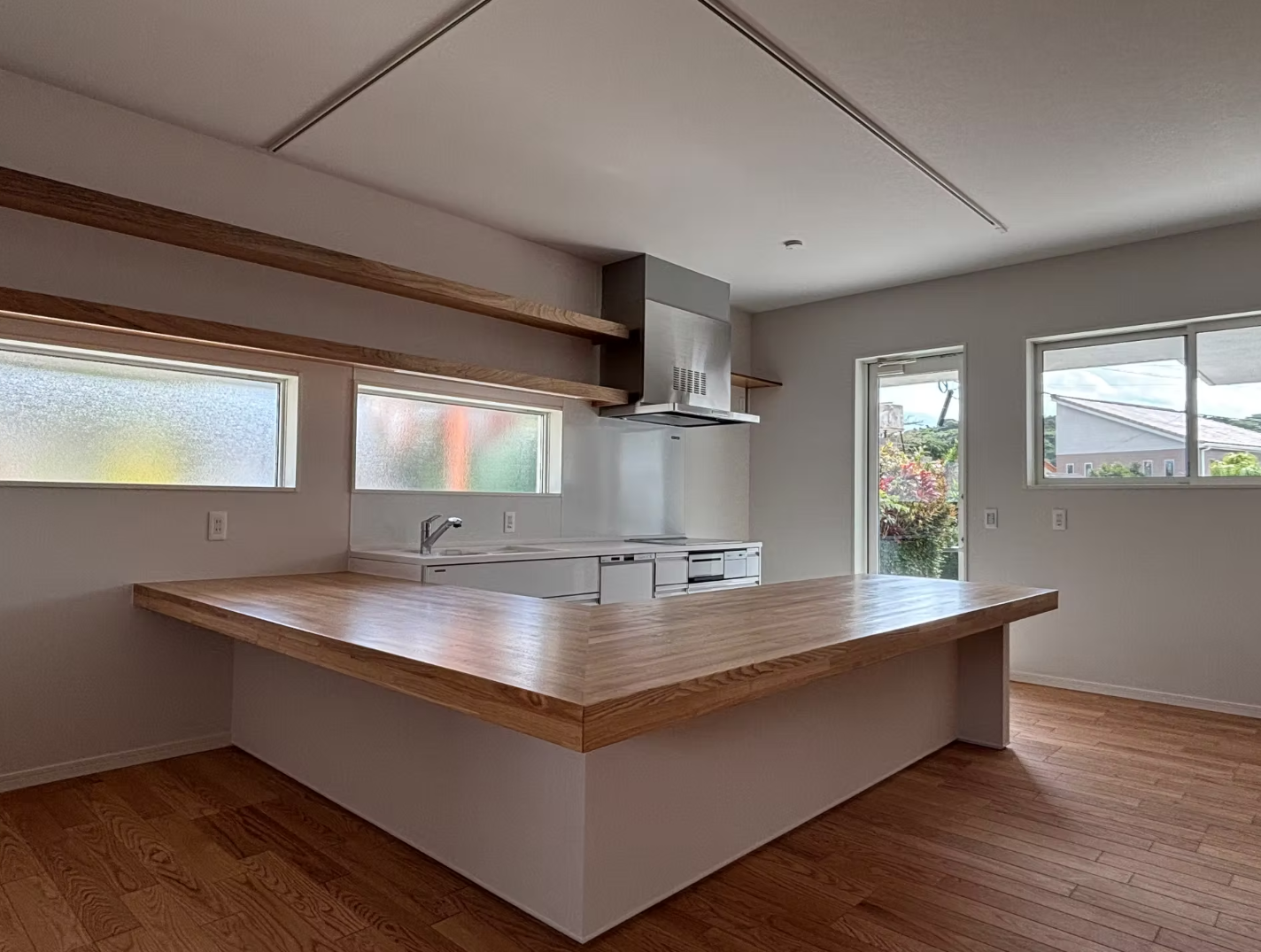 I型のキッチンとつなげたL字型の大きなカウンターテーブルは、食事だけでなくお子さまの勉強や家族の書き物など、多目的に活用できるスペースです。