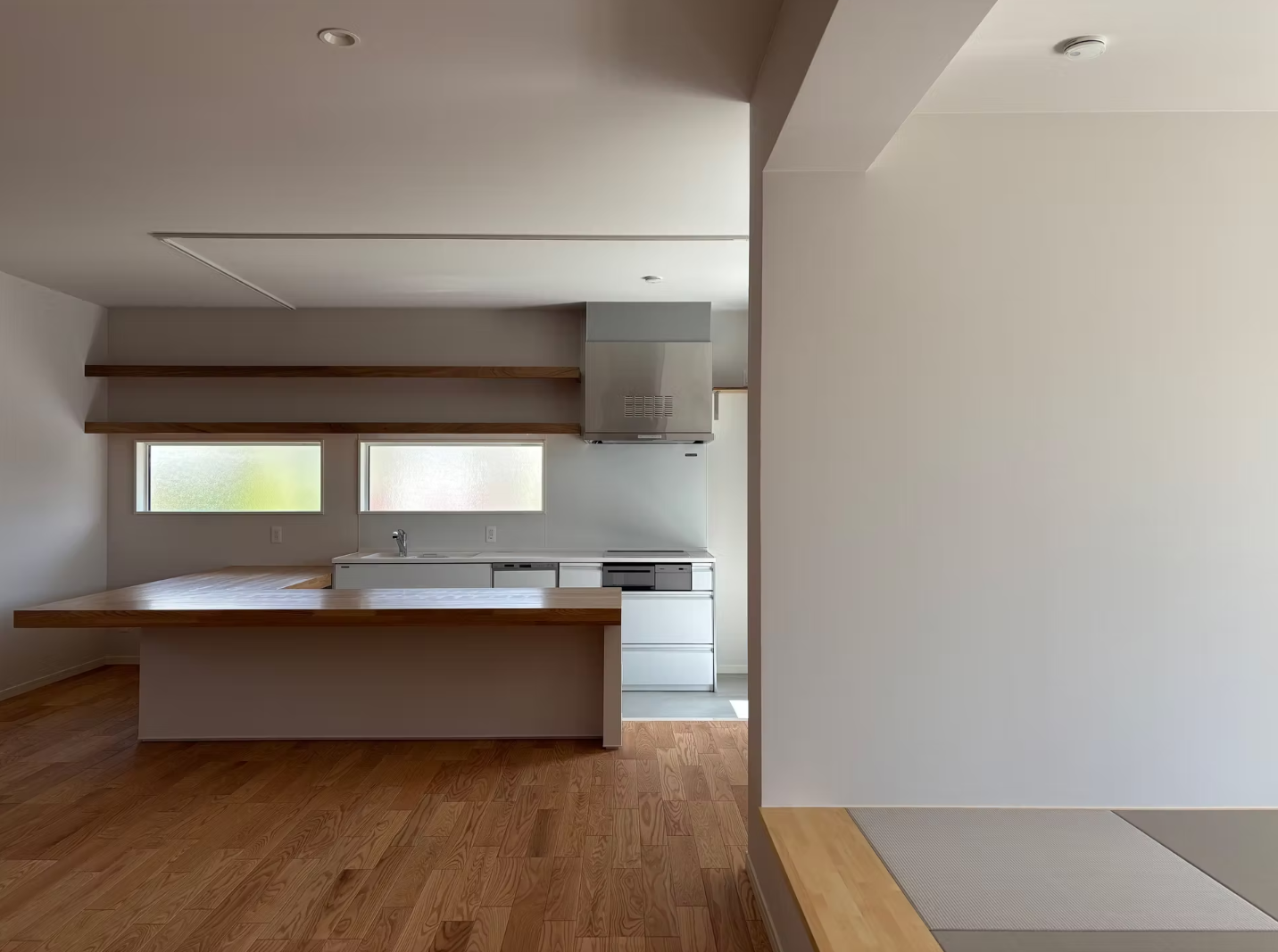 またLDKの一角には小上がりの和室が設けられ、壁や段差を活用して程よい距離感と独立性を持つ場所となっています。
