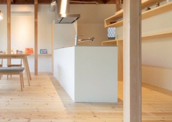 室内は、居間やダイニングといった間取りや用途を固定しない設計とし、その時々で柔軟に変化できる構成にしました。キッチンもシェア感覚で使えるオープンなデザインです。