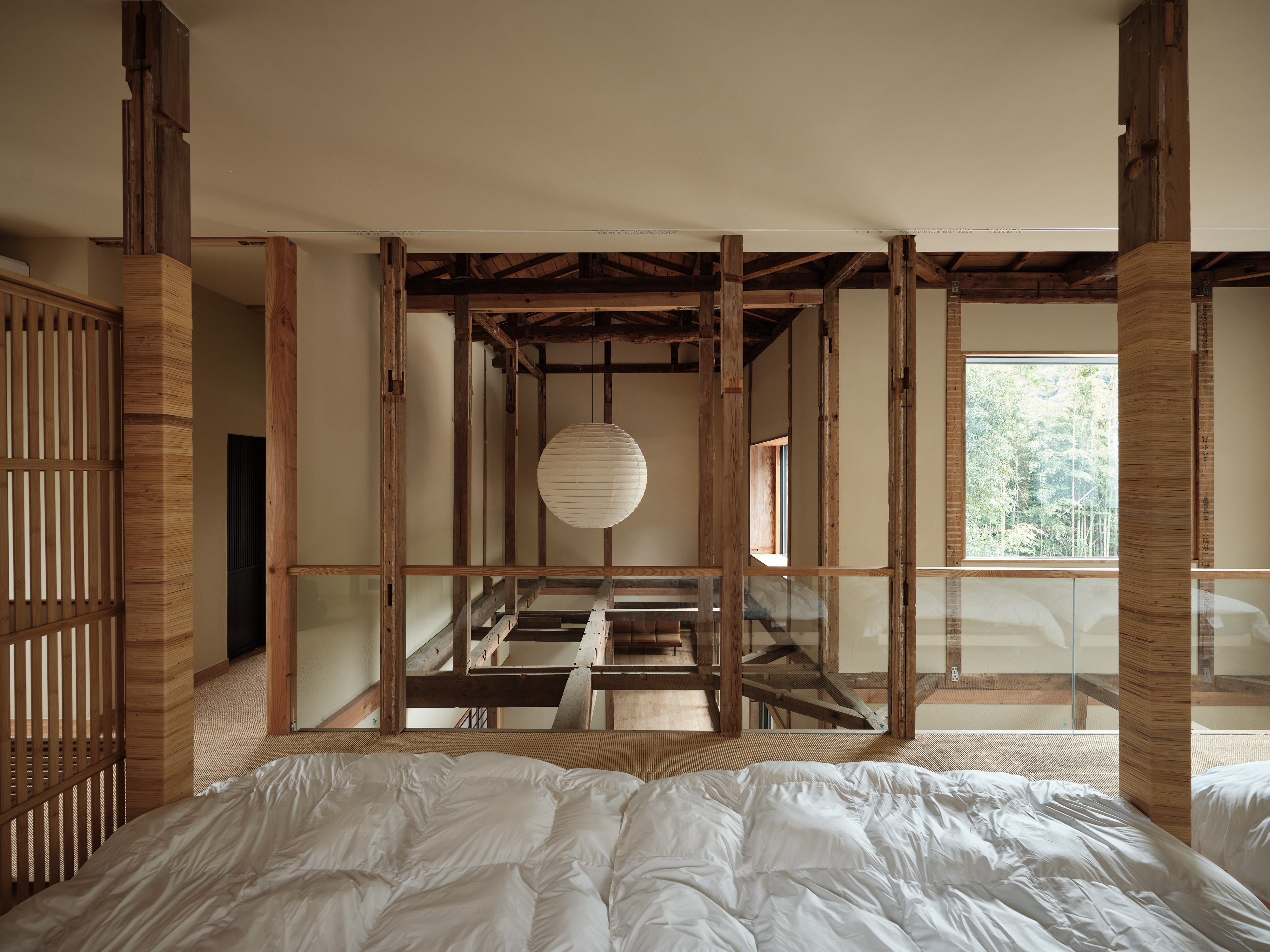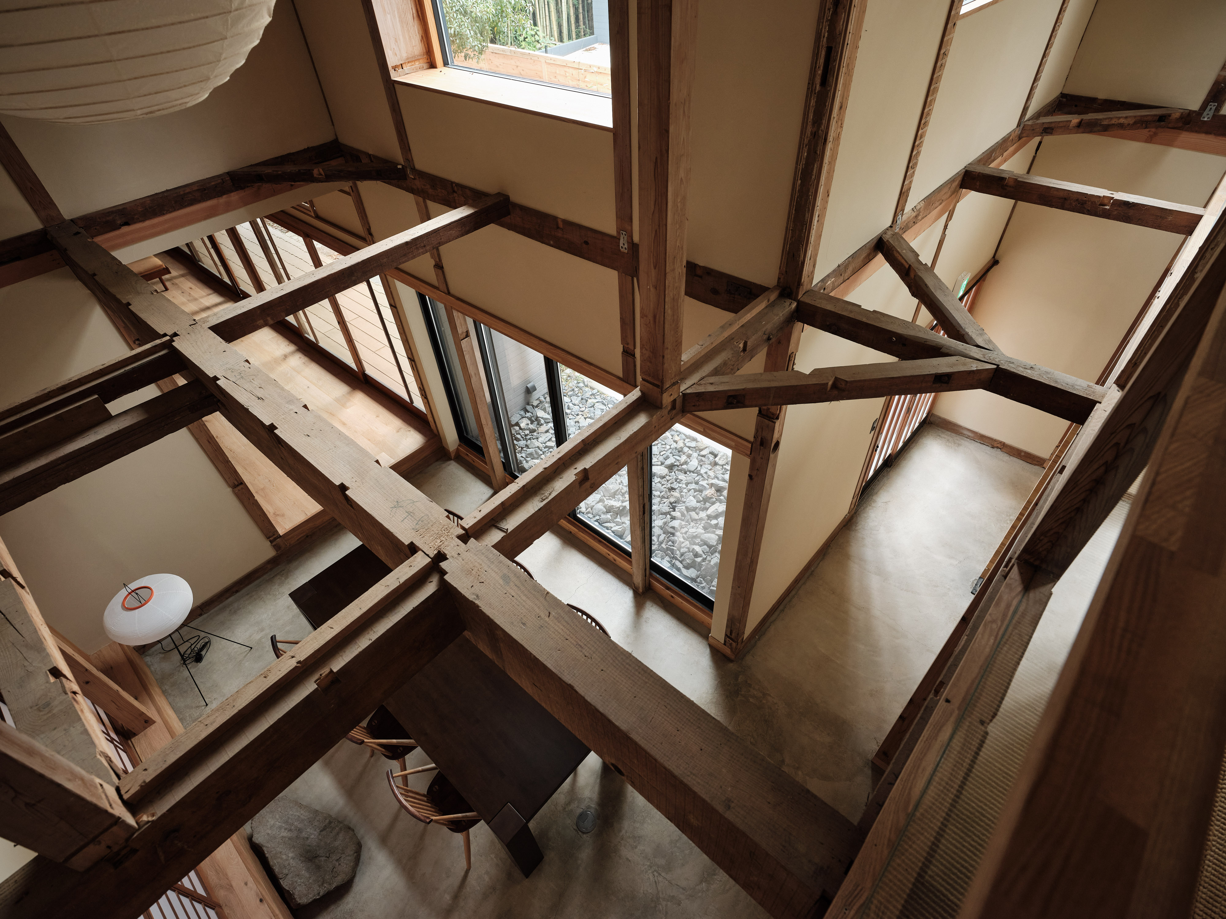築60年を超える箱根の古民家を、現代の暮らしに寄り添いながらも開放感あふれる空間へと再生したリノベーション。長年の増改築を経た建物は、独特の梁や構造に味わいがあり、その魅力を最大限に活かすことから設計は始まりました。梁は可能な限り既存を残し、傷みのある部分のみを補修。古民家ならではの質感と歴史を受け継ぎつつ、新たな空間としての快適性を高めています。