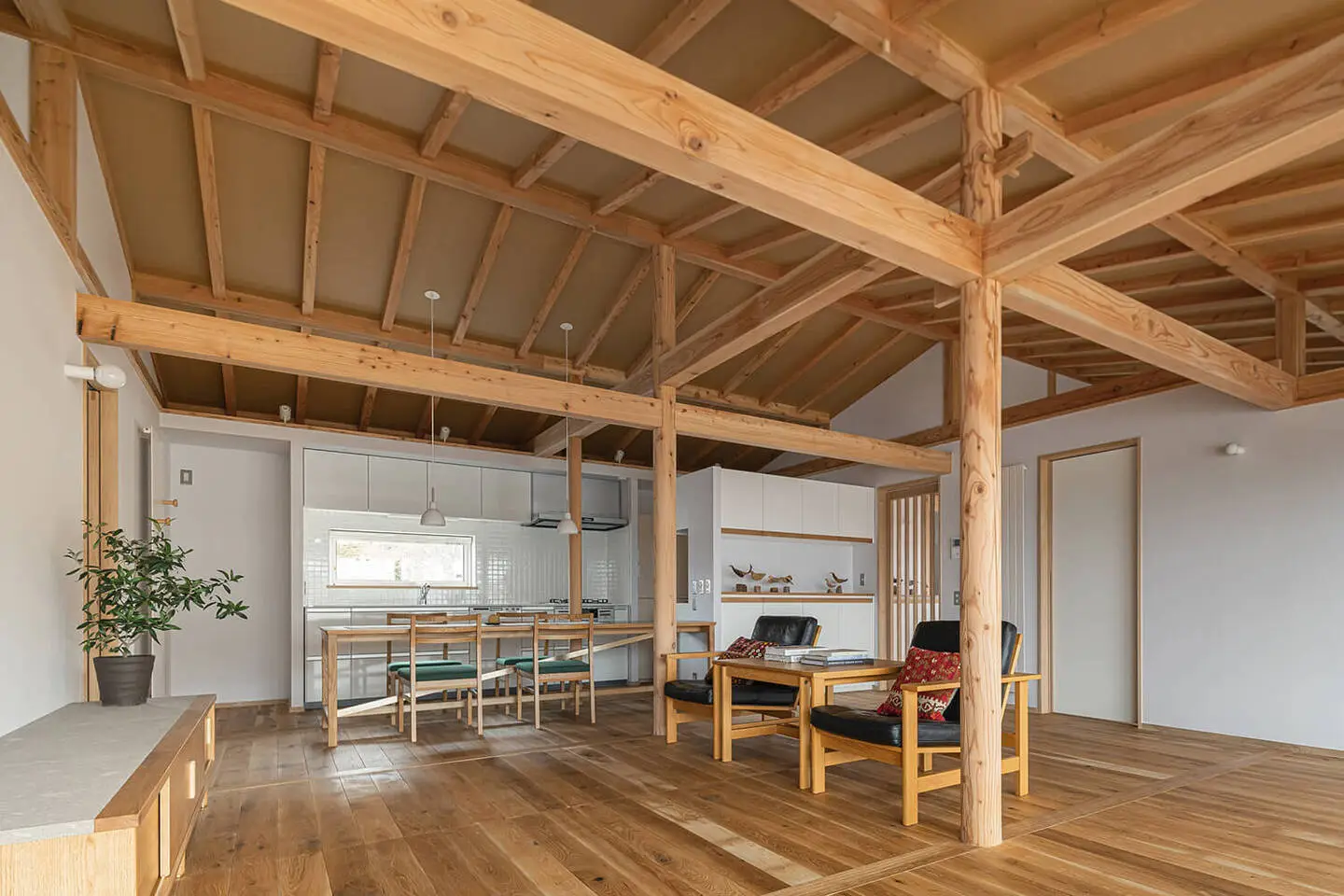 通常、リビングなどのメイン空間には柱を立てない設計が多いのですが、今回は「木材ありき」の住まいづくり。地域で入手できる木材のサイズが限られており、大きな梁をつくることが難しい状況でした。そのため、使用できる梁の大きさや長さから逆算し、空間の中央に柱を設ける設計としました。