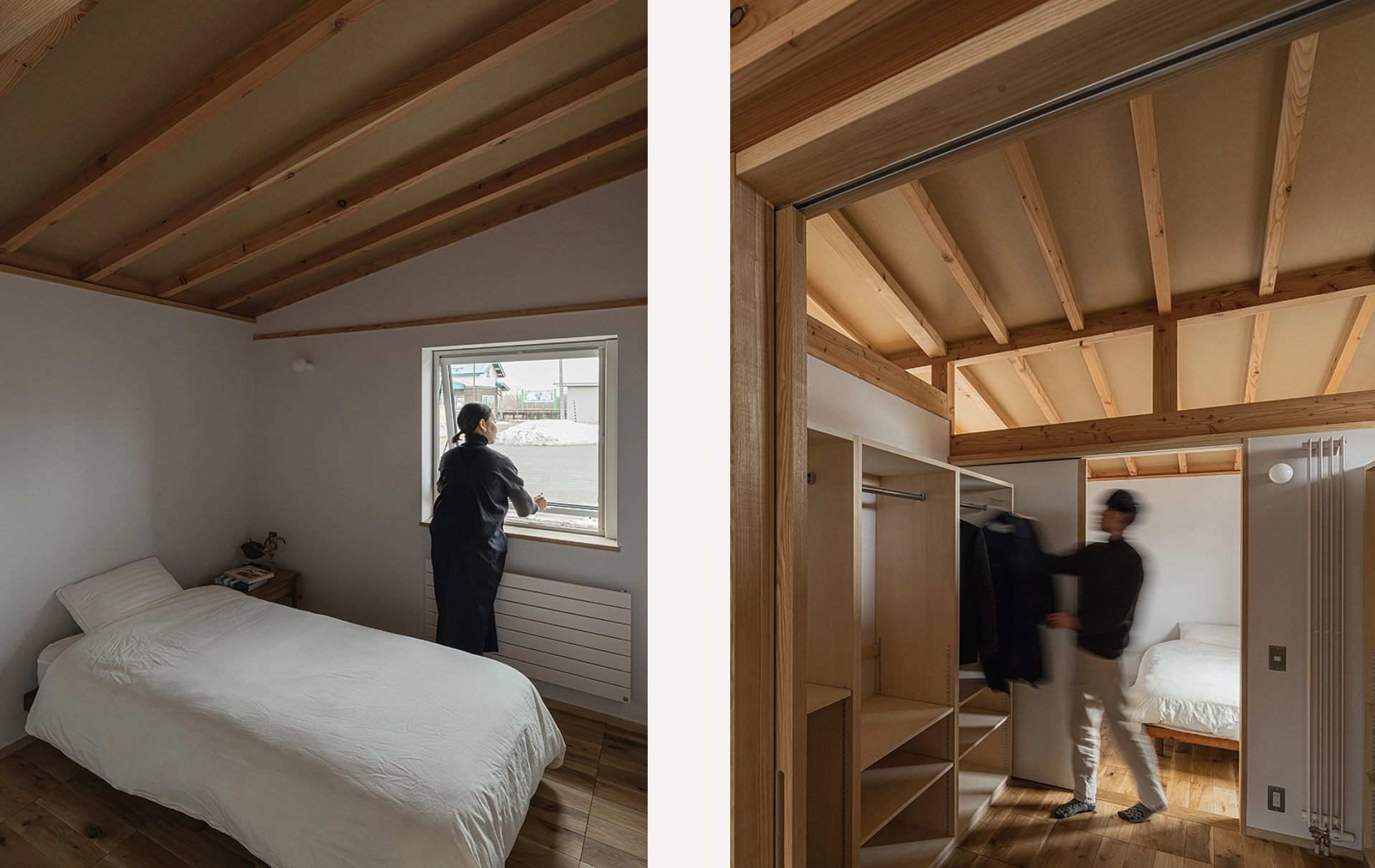 北海道産のスギやヒノキは節が多いという特徴があるため、使い方に工夫が欠かせません。節が多いことを前提に、梁より下の壁は石膏ボードで白く仕上げるという「割り切り」を採用しました。これにより、すっきりとした空間を保ちながら自然素材の魅力を引き出し、意匠的にも整った印象になります。