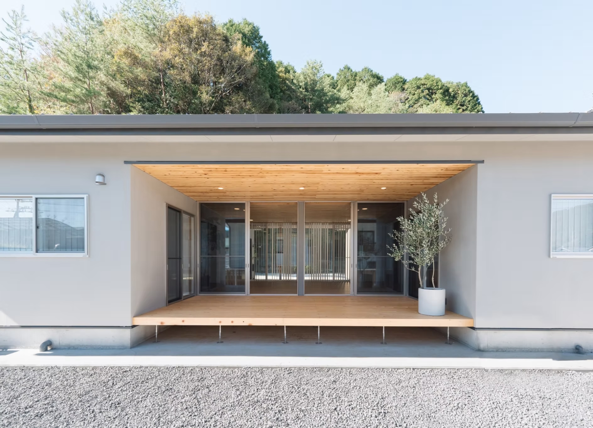 地域に開かれた暮らしをテーマに設計された平屋住宅は、敷地の広さを活かし、中心に地域や家族が自然に集まれる大きな交流スペースを配置しています。玄関を通らずに出入りできる動線を備えることで、暮らしの延長に地域との関わりが生まれる、開放的な住まいです。