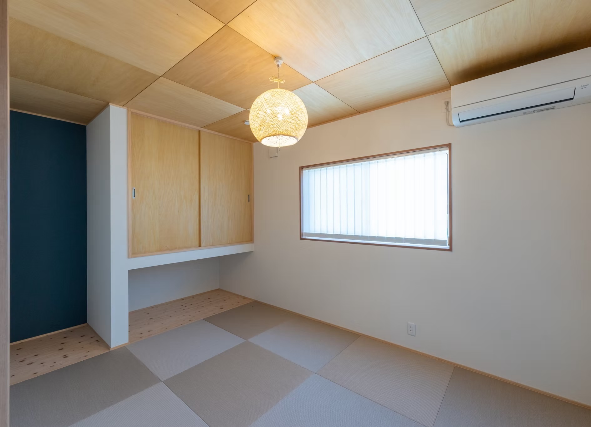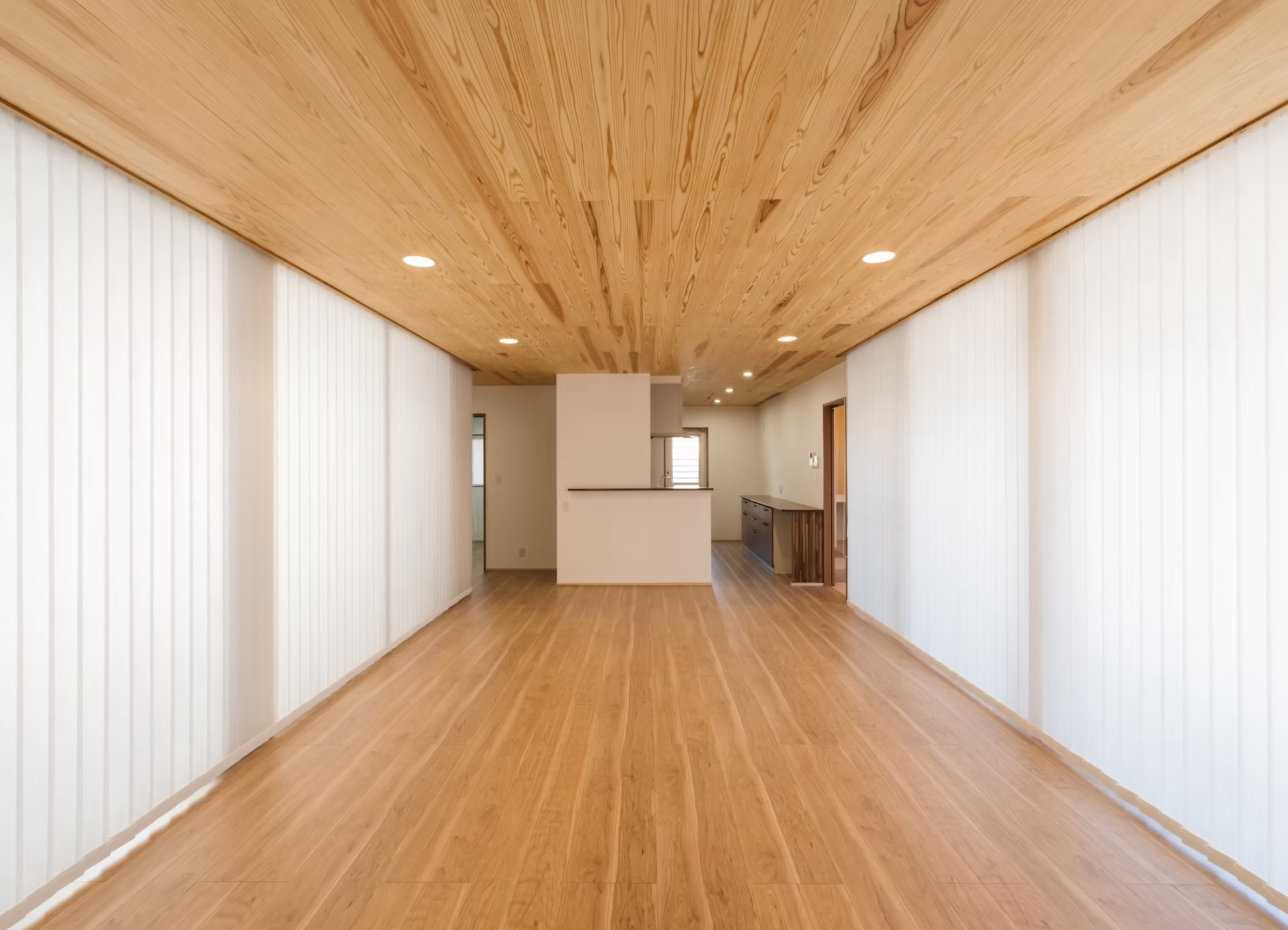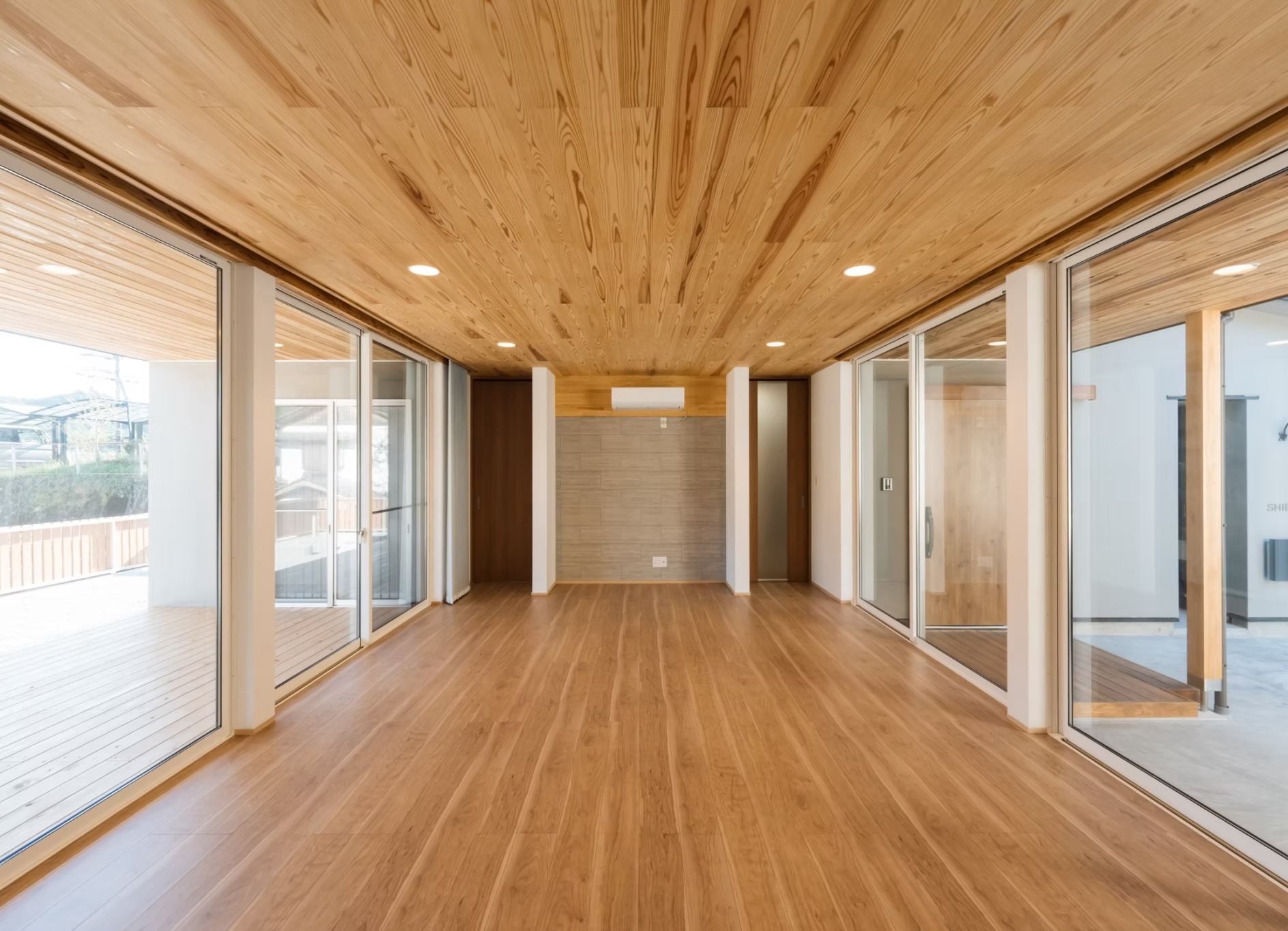 素材にもこだわり、木の自然素材をふんだんに使用。優しい質感と経年変化が、室内に温もりと安心感をもたらします。仕切りを減らし、光と風が通り抜ける中央スペースは、日常の団らんから地域の集まりまで、多様なシーンに対応できる柔軟さを備えています。