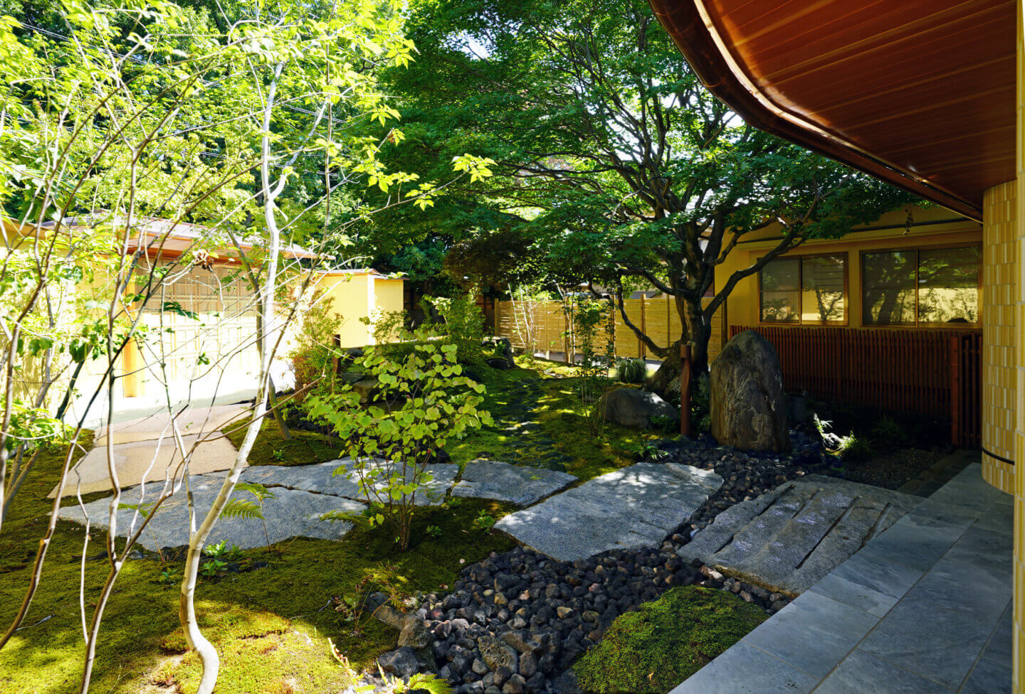 直線的に玄関へ進むのではなく、石垣を回り込み、小さな築山を迂回しながら玄関へと向かうデザインにしたことで、視線の角度が変わり、季節の木々や自然石の表情を楽しむことができます。山取りの樹木を取り入れ、枝ぶりの力強さや光を求めて伸びる姿を活かすことで、庭に躍動感が生まれました。(写真1・2)