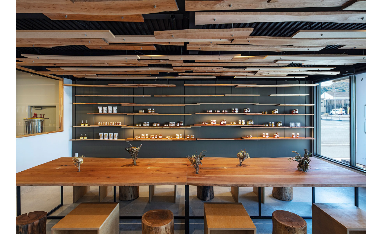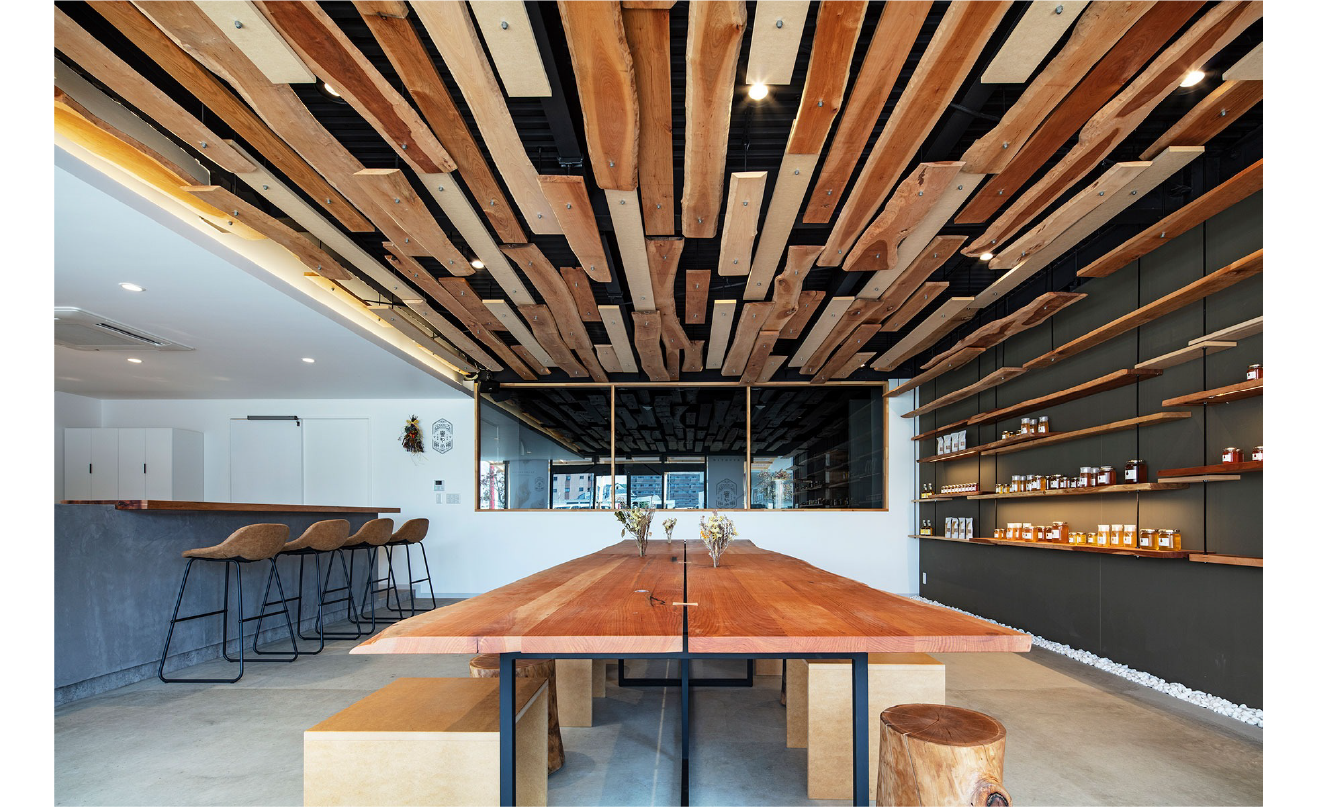 象徴的なのは耳付き板を浮かべた天井。多様な曲線をずらしながら配置することで、木々の豊かな風景を思わせます。同じ木材で仕立てたテーブルや棚が呼応し、空間全体に一体感を与えています。