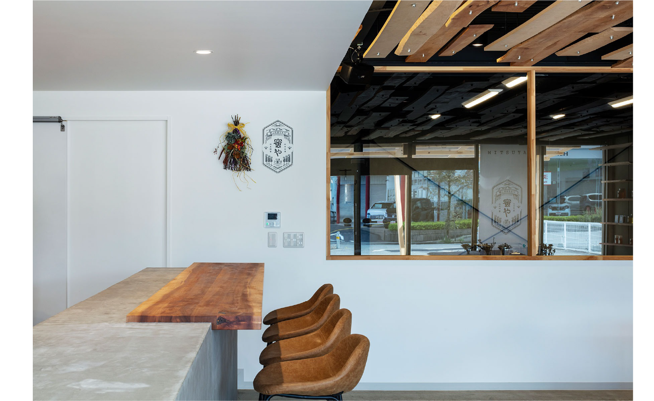 床はモルタル仕上げとし、カウンターには耐水性のあるモールテックスを採用。山桜の木材と組み合わせることで、木のぬくもりを引き立てながら異素材の調和を生み出します。住宅でも水まわりや造作家具に取り入れれば、デザイン性と機能性を両立できます。