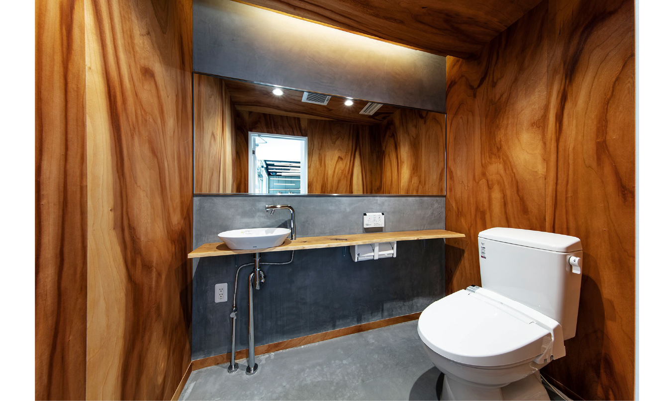 特筆すべきは細部まで丁寧に作り込まれたトイレ空間。小さな空間だからこそ個性を宿したい──そんな思いも込められ朱里桜の突板が選ばれました。