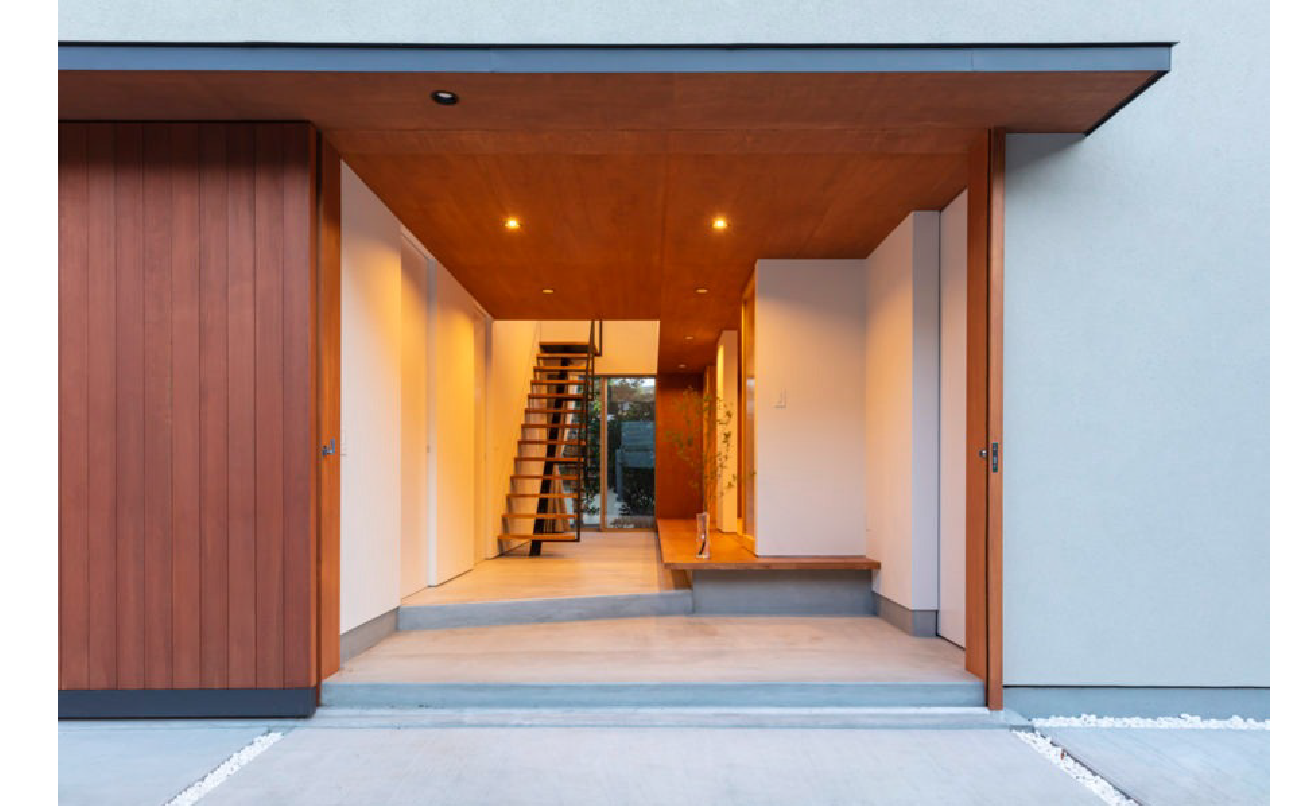 外観は白い壁にアクセントとなるピーラー材の大きな扉が特徴。玄関前の通りは限られた住人だけが行き交い、プライバシーを守りながら地域に溶け込んでいます。扉を開放すれば、土間空間を通じて裏の庭にまで視線が抜けるので、お子さんが存分に遊べる環境が広がります。