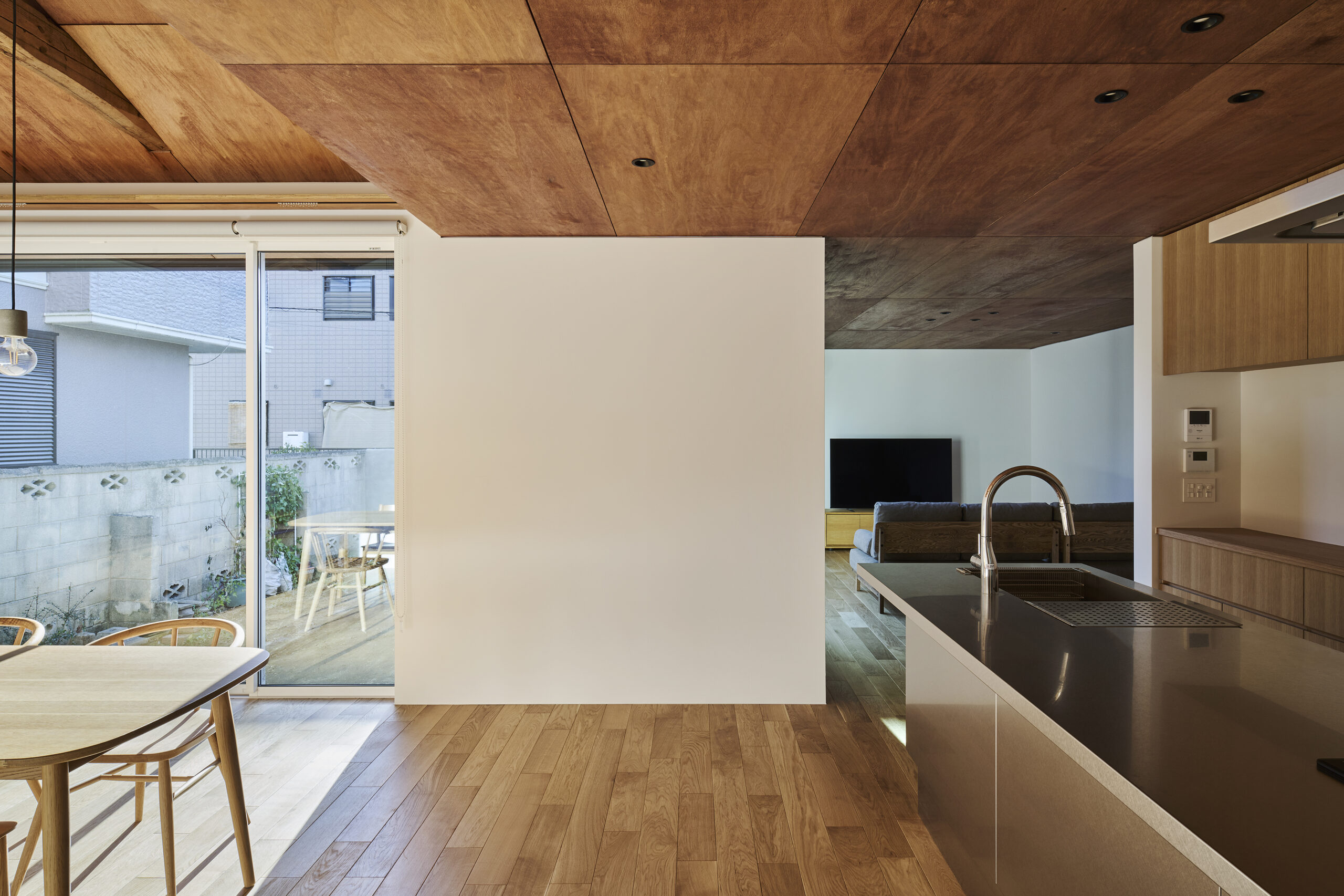 床にはお施主様が希望されたオーク材を採用。天井は梁を表しにし、仕上げにはラワンベニアを用いてオイル塗装で色を調合しました。この塗装作業はDIYでご家族も一緒に参加し、いくつかのパターンを試しながら「自分たちの色」をつくりあげています。手に入れやすい素材にひと手間を加えることで、新しい部分と古いものが心地よく調和する空間となりました。
