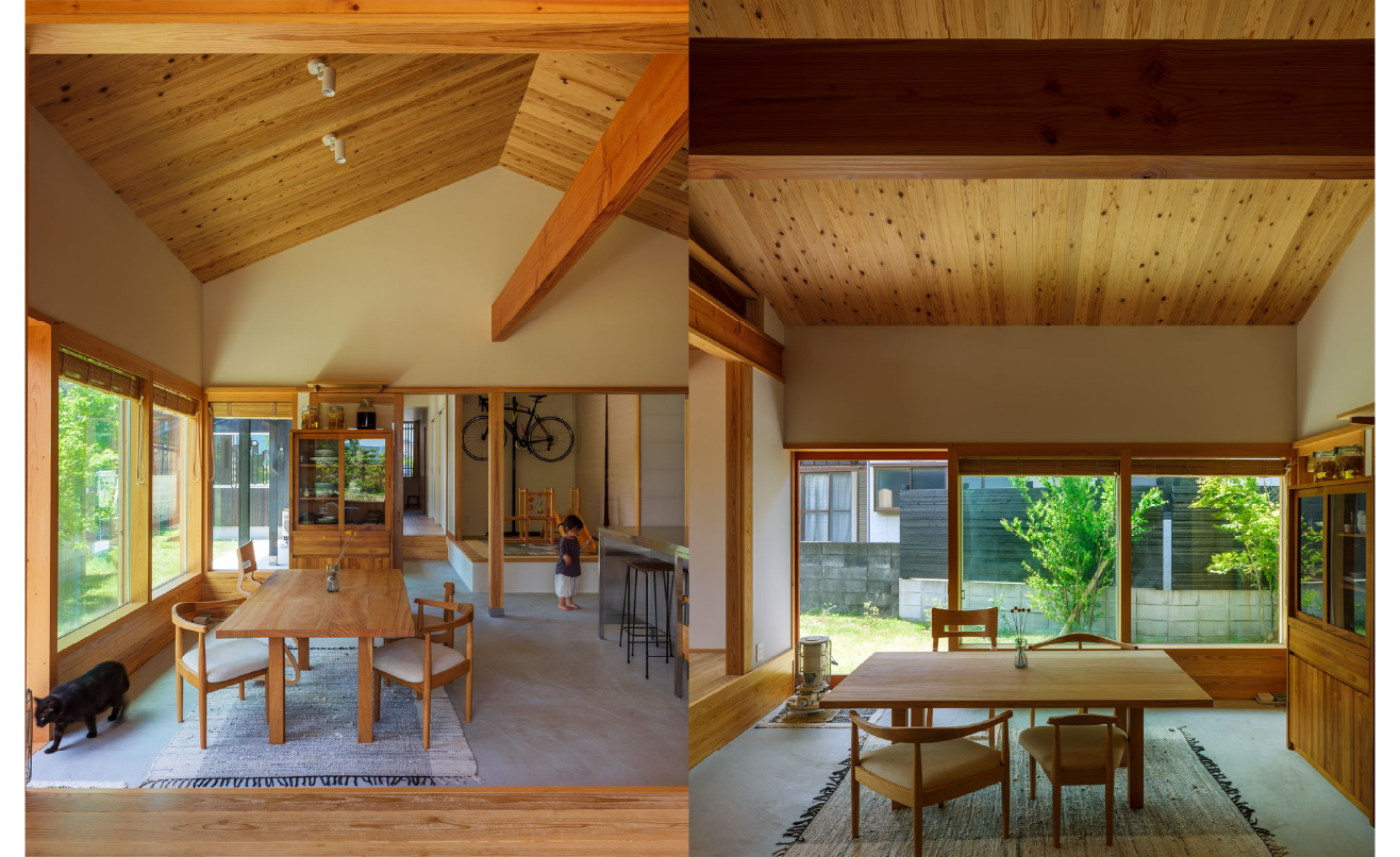 内部は自然素材を中心に構成。漆喰壁が光を包み、杉板天井は構造を顕して経年の表情を深めます。